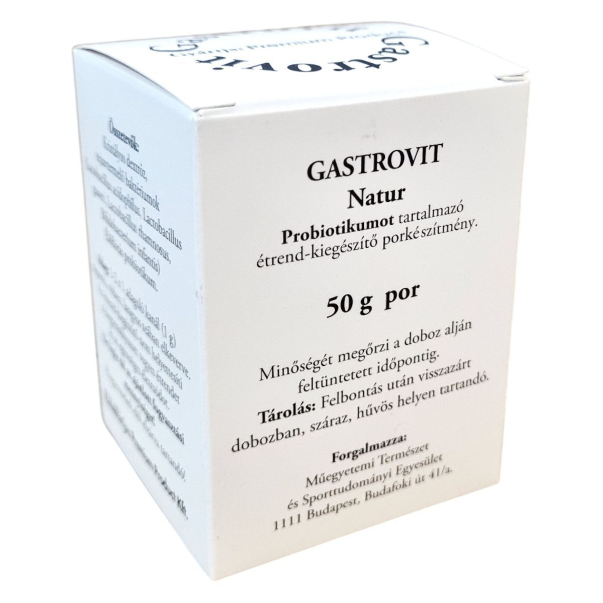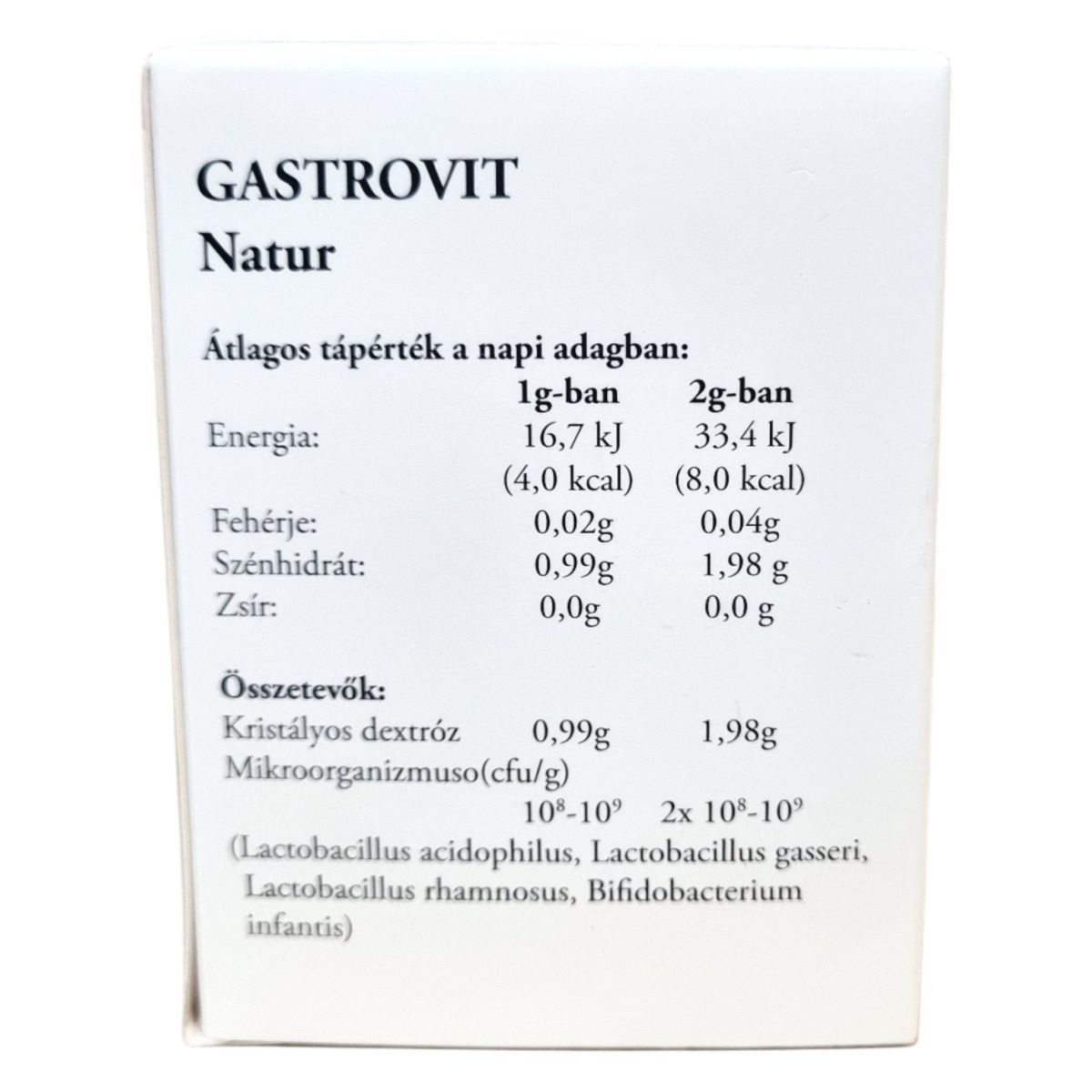 A Gastrovit Natur probiotikumot tartalmazó étrend-kiegészítő porkészítmény, amely Lactobacillus és Bifidobacterium törzseket tartalmaz. A termék kristályos dextróz alapú, amely segíti a baktériumok stabilitását. Élőflórás probiotikumként hozzájárulhat a bélrendszer természetes mikrobiális egyensúlyának fenntartásához. A napi adag egyszerűen bekeverhető folyadékba, és könnyen beilleszthető a mindennapi étrendbe. A terméket a Premium Product Kft. gyártja, forgalmazója a Műegyetemi Természet- és Sporttudományi Egyesület. Felbontás után javasolt hűvös, száraz helyen tárolni, a csomagolást gondosan visszazárva.