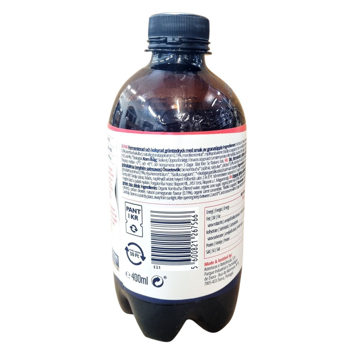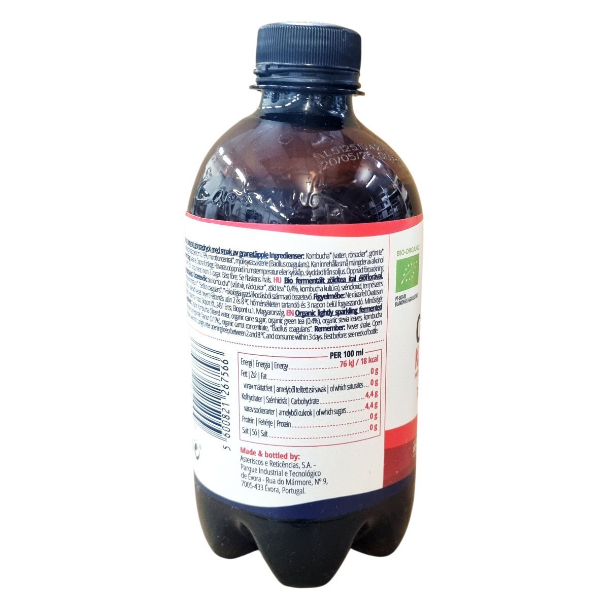 bio kombucha* (szűrt víz, bio nádcukor*, bio zöld tea* 0,4%, kombucha kultúra), szén-dioxid, természetes gránátalma aroma 0,19%, bio sárgarépa-koncentrátum*, „Bacillus coagulans”.