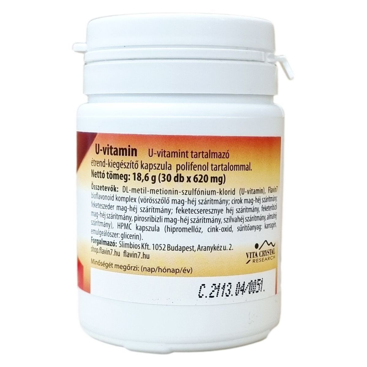 A Flavin7 U vitamin étrend-kiegészítő kapszula egy különleges összetételű termék, amely DL-metil-metionin-szulfónium-kloridot (U-vitamint) és egy bioflavonoid komplexet tartalmaz többféle gyümölcshéj és mag szárítmányából. Ezek az összetevők természetes forrásból származó polifenolokat és flavonoidokat biztosítanak, amelyek hozzájárulhatnak a szervezet antioxidáns védelméhez. A termék HPMC kapszulában kerül forgalomba, amely hipromellózt tartalmaz, valamint a cink-oxid, karragén és glicerin segíti a megfelelő állagot és stabilitást. Az egy kapszulában található hatóanyag-mennyiség az ajánlott napi fogyasztást 1-2 darabon belül tartja, hogy elősegítse a könnyű beilleszthetőséget a mindennapi étrendbe.