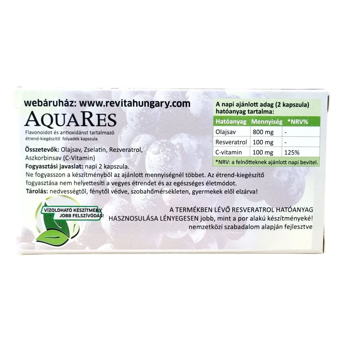 A Revita HUNGARY által forgalmazott AQUARES egy flavonoidokat és antioxidánsokat tartalmazó étrend-kiegészítő folyadék kapszula, amely vízoldható formában készült, így jobban felszívódhat. A készítményben található resveratrol hatóanyag hasznosulása nemzetközi szabadalom alapján fejlesztett technológiával lényegesen jobb, mint a por alakú készítmények esetében. A kapszula napi két darabos adagjának összetevői között olajsav, resveratrol és C-vitamin (aszkorbinsav) szerepel, melyek a szervezet egészséges működését támogathatják. A termék kizárólag tisztán előállított összetevőket tartalmaz, és a tárolási körülményeket figyelembe véve megőrzi minőségét a dobozon feltüntetett időpontig.