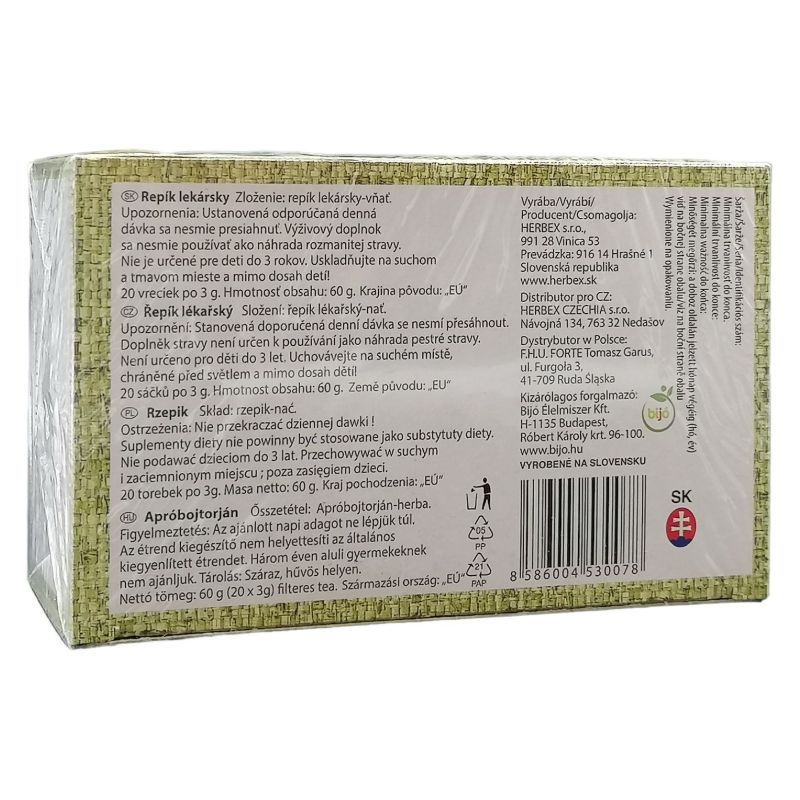 Növeli az étvágyat és segíti a gyomorsav termelődést. Emésztőrendszeri panaszok kezelésére is alkalmas. Használhatjuk szájüreg és torok öblögetésre. Összetétel: apróbojtorján. Nettó tömeg: 60 g, 20 db 3 g-os filter tasak. Elkészítése: 1 filter tasakot leforrázunk 0,5 l forró vízzel, majd 10 percig állni hagyjuk.