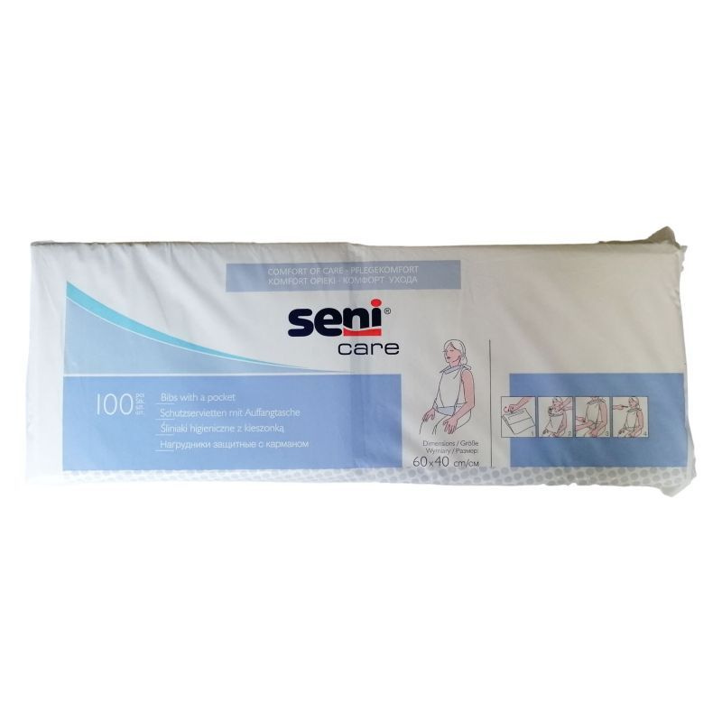 Seni Care egyszer használatos zsebes etetőelőke cellulóz anyagból polietilén fólia borítással.