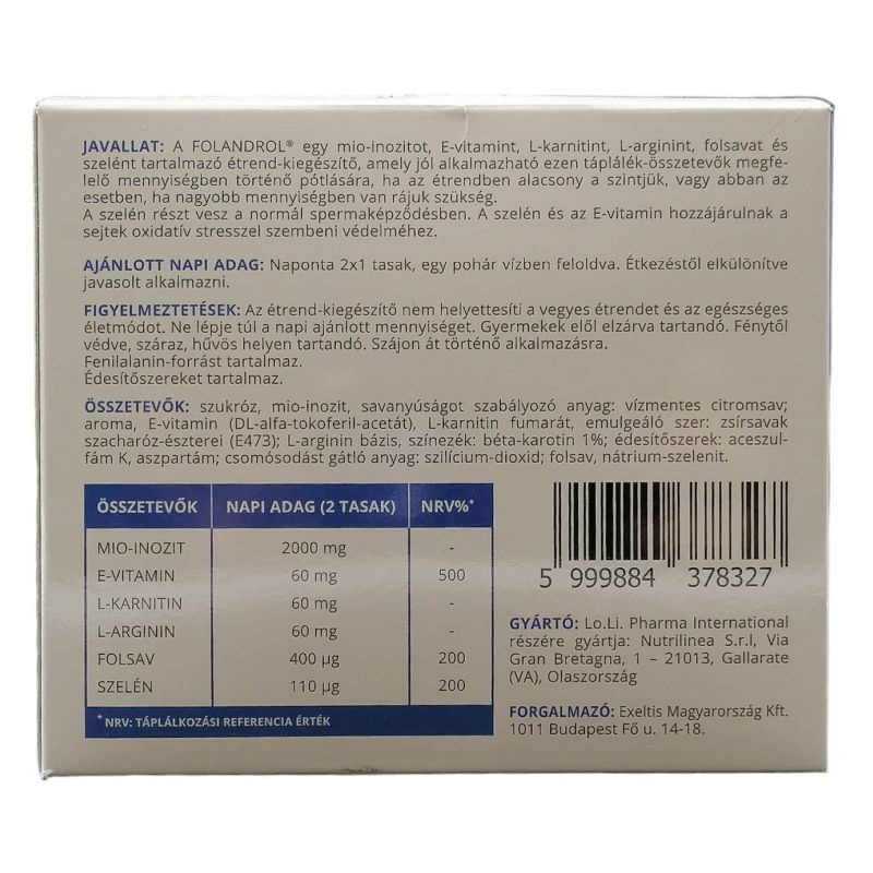A Folandrol mio-inozitot, E-vitamint, L-karnitint, L-arginint, folsavat és szelént tartalmazó étrend-kiegészítő, amely jól alkalmazható ezen táplálék-összetevők megfelelő mennyiségben történő pótlására, ha az étrendben alacsony a szintjük, vagy abban az esetben, ha nagyobb mennyiségben van rájuk szükség. A szelén részt vesz a normál spermaképződésben és hozzájárul az immunrendszer normál működéséhez. A szelén és E-vitamin hozzájárulnak a sejtek oxidatív stresszel szembeni védelméhez. A folát részt vesz a normál aminosav-szintézisben és szerepet játszik a sejtosztódásban, továbbá hozzájárul a normál homocisztein-anyagcseréhez, a normál vérképződéshez és az immunrendszer megfelelő működéséhez.