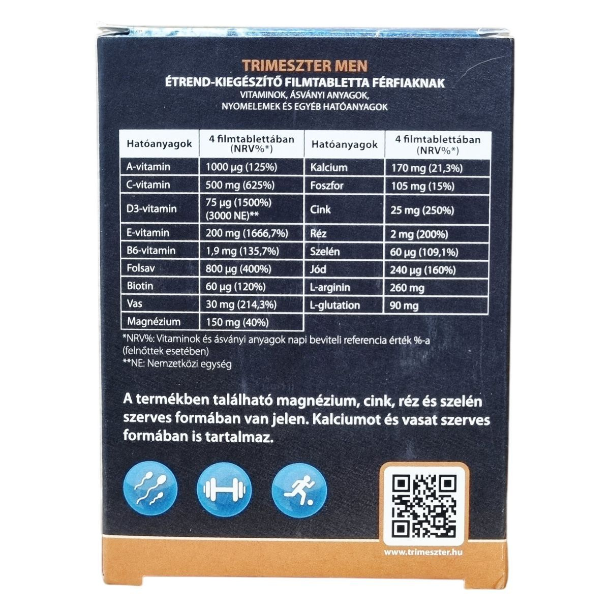 A Trimeszter Men étrend-kiegészítő filmtabletta vitaminok, ásványi anyagok, nyomelemek és egyéb hatóanyagok kombinációját tartalmazza, különösen férfiak számára fejlesztve a normál spermaképződés és termékenység fenntartása érdekében. Új D3-vitamin tartalommal rendelkezik, és allergénmentes összetételű. Szerves kötésű ásványi anyagokat, például magnéziumot, cinket, rezet és szelént is tartalmaz, valamint kalciumot és vasat is szerves formában. Az A-vitamin részt vehet a sejtek differenciálódásában és az immunrendszer működésében, míg a B6-vitamin hozzájárulhat a hormonális aktivitás szabályozásához. A C-vitamin fokozhatja a vas felszívódását, segítheti a kollagén képződését és az immunrendszert intenzív testmozgás alatt. A szelén szerepet játszhat a spermaképződésben és a pajzsmirigy működésében. A cink hozzájárulhat a normál termékenységhez, a tesztoszteronszint fenntartásához, és az immunrendszer védelméhez. A termék támogathatja a sejtosztódást, az egészséges izomfunkciót, valamint a normál energiatermelő anyagcsere-folyamatokat is. Alkalmassá teheti a sportolók számára is a fogyasztását, mivel komplex összetétele révén hozzájárulhat a szervezet egészséges működéséhez.