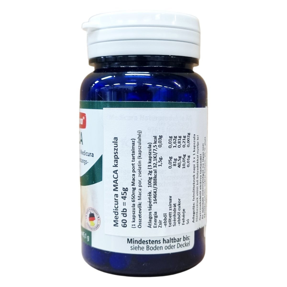 A termék 60 darab kapszulát tartalmaz, melyek össztömege 45,1 gramm. Egy kapszula 650 mg Maca port tartalmaz, amely természetes összetevőként szolgál. Az energia- és tápértékadatok alapján 3 kapszula 32,1 kJ/7,5 kcal energiát biztosít, a zsír bevitel csekély, telített zsírsav tartalma minimális. A készítményt ajánlott főétkezések előtt, bő folyadékkal bevenni. A kapszula héja zselatin alapú. Tárolását 25 °C alatt, száraz, hűvös helyen kell biztosítani. A termék a vegán étrendet követők számára is alkalmas. Gyermekektől el kell zárni, és az ajánlott napi adagot nem szabad túllépni.