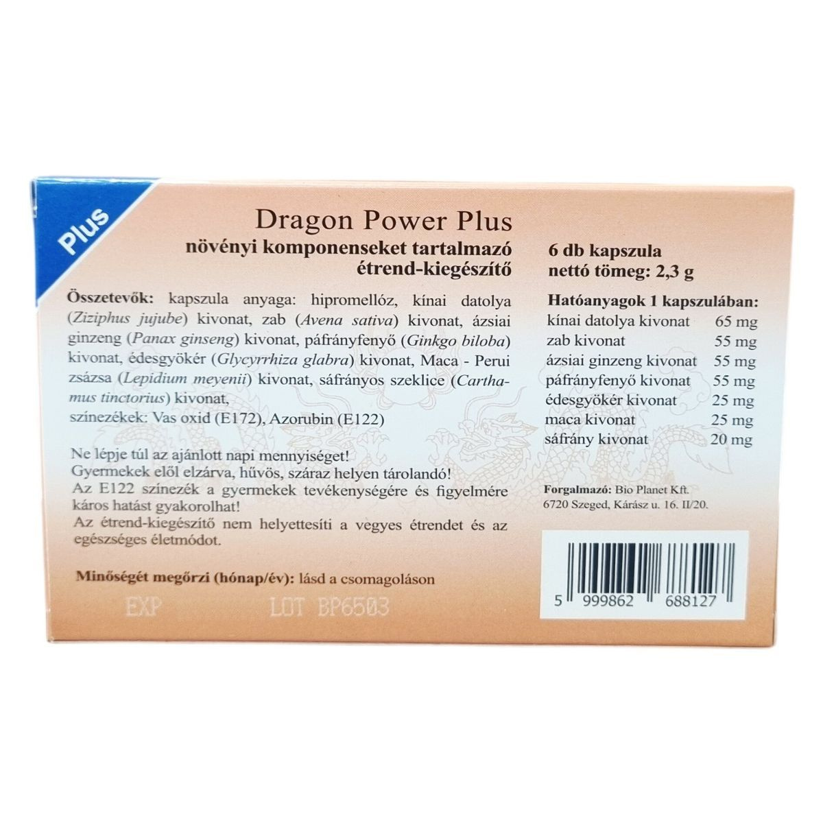 A Dragon Power Plus kapszula növényi kivonatokat tartalmaz, mint a kínai datolya, zab, ázsiai ginzeng, páfrányfenyő, édesgyökér, maca és sáfrány, amelyek együttesen támogathatják a szervezet testi és szellemi harmóniáját. A ginzeng és a maca segíthet ellensúlyozni a fáradtságot, illetve hozzájárulhatnak a libidó és a szexuális vágy fokozódásához. A kapszula hipromellóz alapú, a színezékek között szerepel a vas-oxid (E172) és az Azorubin (E122), amely a gyermekek figyelmére negatív hatással lehet. A termék nem helyettesíti a vegyes táplálkozást és az egészséges életmódot. Nettó tömege 2,3 g, 6 kapszulát tartalmaz a csomagolás.