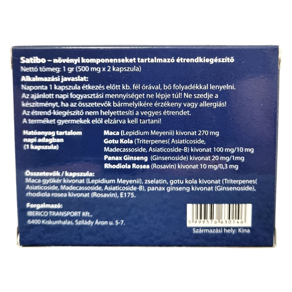 A Satibo növényi komponenseket tartalmazó étrend-kiegészítő kapszulánként 1 gramm, azaz 500 mg hatóanyagot tartalmaz, két kapszulában összesen 1 gramm található. Az összetevők között szerepel a Maca gyökér kivonat, gotu kola kivonat triterpén alkotóelemekkel, Panax Ginseng kivonat ginszenosidokkal, valamint Rhodiola Rosea kivonat rosavinnal, amelyek együttesen alkothatják a termék hatóanyag-profilját. A készítmény zselatin kapszulába töltve kerül forgalomba, a származási helye Kína. A terméket naponta egy kapszulában, étkezés előtt kb. fél órával ajánlott bő folyadékkal bevenni. A fogyasztók a készítményt nem léphetik túl az ajánlott napi mennyiséget, illetve tartózkodniuk kell a használatától, amennyiben az összetevők valamelyikére allergiásak vagy érzékenyek. A termék nem helyettesíti a változatos étrendet, és gyermekek elől elzárva kell tárolni. Forgalmazóként az IBERICO TRANSPORT Kft. szerepel, székhelye Kiskunhalason található.