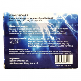 A STRONG POWER egy 4 kapszulából álló kiszerelésű étrendkiegészítő, amelynek nettó tömege 2 gramm. Kizárólag növényi kivonatokat tartalmaz, így természetes összetevői lehetnek a Maca gyökér, Gotu Kola, Panax Ginseng és Rhodiola Rosea. A termék Kínában készül. Magas vérnyomás esetén, vagy érzékenység esetén tanácsos az alkalmazását mérlegelni. Fontos megjegyezni, hogy az étrend-kiegészítő nem helyettesíti a kiegyensúlyozott étrendet és az egészséges életmódot, ezért használata mellett is javasolt a változatos táplálkozás és rendszeres mozgás.