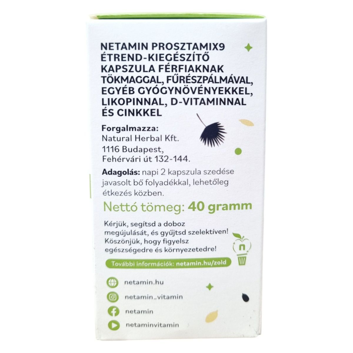 A Netamin Prosztamix9 kapszula 9 aktív összetevőt tartalmazhat, mint például tökmag, fűrészpálma és kisvirágú füzike, amelyek hozzájárulhatnak a férfiak egészségének támogatásához.