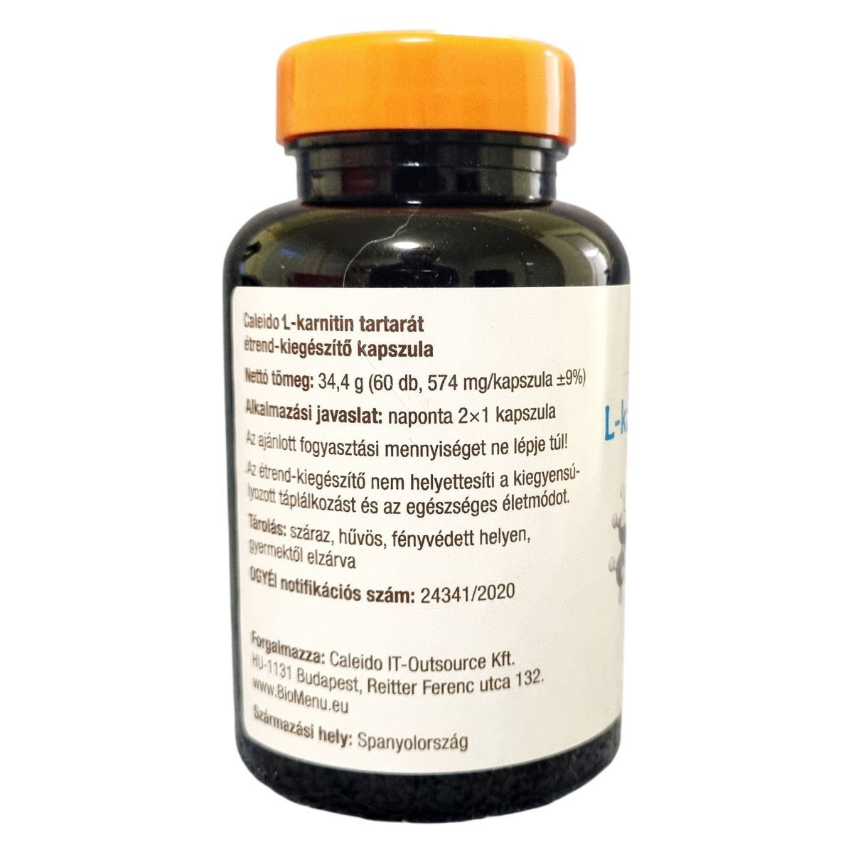 A Caleido L-karnitin tartarát kapszula származási helye Spanyolország. A termék nettó tömege 34,4 g, kapszulánkénti tömege körülbelül 574 mg a megengedett eltérés ±9%. A kapszula összetevői között megtalálható az L-karnitin-tartarát, a csomósodást gátló szilícium-dioxid, valamint a kapszulahéj anyagai, mint a hidroxipropil-metil-cellulóz, karragén, kálíum-acetát, természetes színezék (kalcium-karbonát) és módosított keményítő. A termék OGYÉI notifikációs számmal rendelkezik, ami a törvényes forgalmazást igazolja. A készítmény alkalmazása mellett ajánlott a kiegyensúlyozott étrend és az egészséges életmód fenntartása.