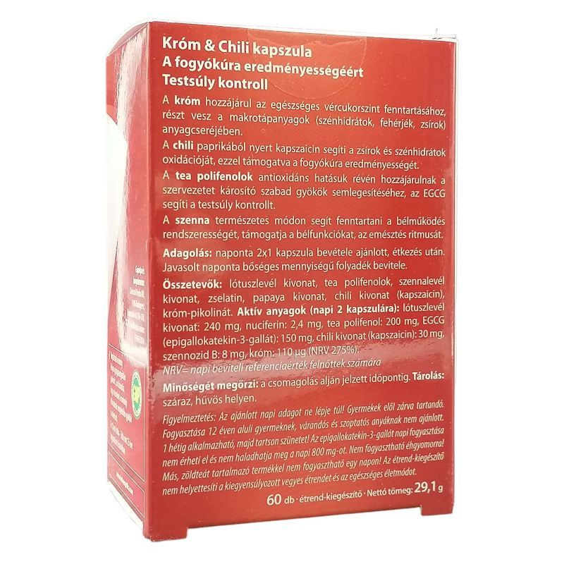 A króm hozzájárul az egészséges vércukorszint fenntartásához, részt vesz a makro tápanyagok (szénhidrátok, fehérjék, zsírok) anyagcseréjében. A chili paprikából nyert kapszaicin segíti a zsírok és szénhidrátok oxidációját, ezzel támogatva a fogyókúra eredményességét. A tea polifenolok antioxidáns hatásuk révén hozzájárulnak a szervezetet károsító szabad gyökök semlegesítéséhez, az EGCG segíti a testsúly kontrollt. A szenna természetes módon segít fenntartani a bélműködés rendszerességét, támogatja a bélfunkciókat, az emésztés ritmusát.