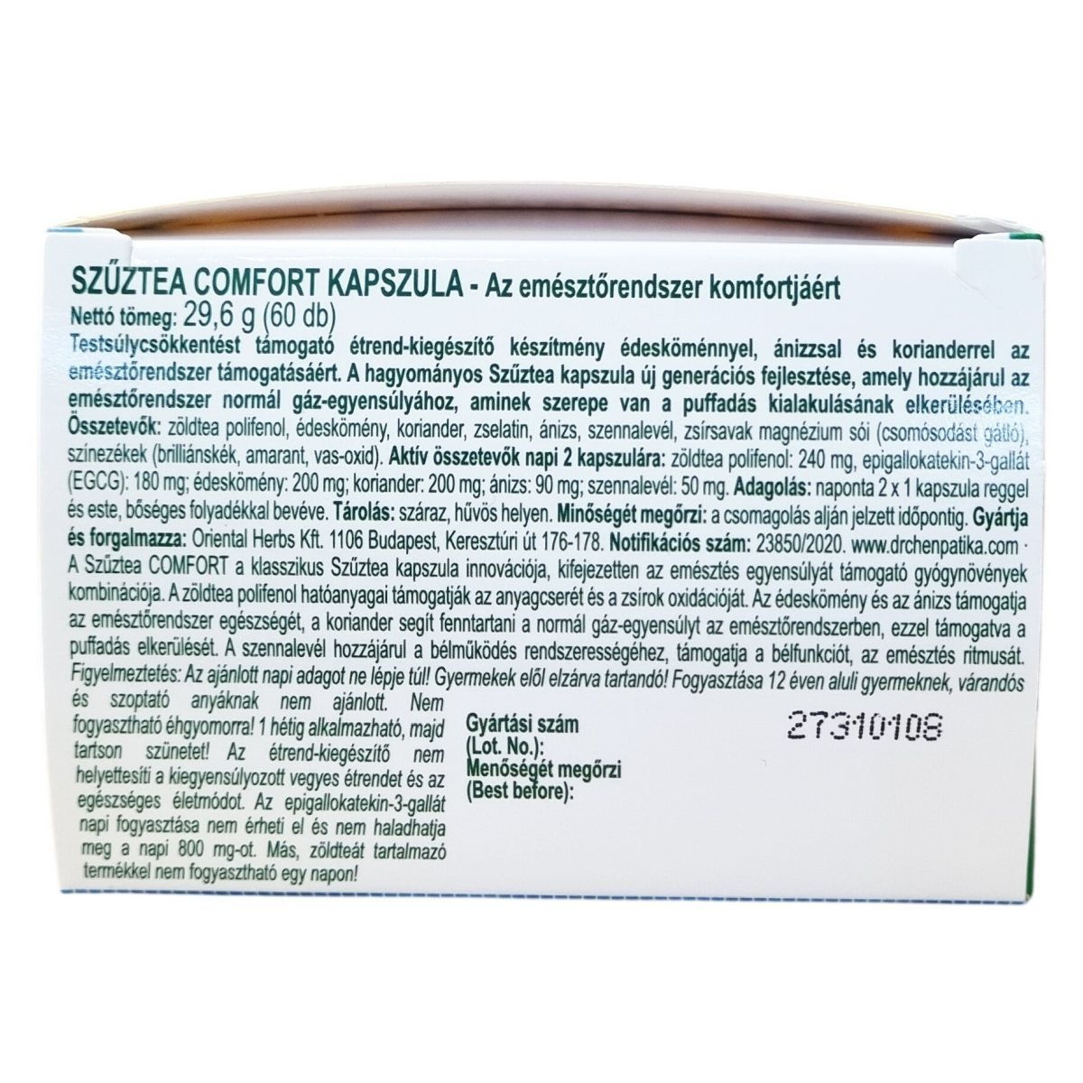 A Szűztea Comfort a hagyományos Szűztea új generációs fejlesztése, amely kifejezetten az emésztés normál gáz-egyensúlyának fenntartását célozza. Összetevői között megtalálható a zöldtea polifenol, mely hozzájárulhat az anyagcsere támogatásához és a zsírok oxidációjához, valamint az olyan gyógynövények, mint az édeskömény és az ánizs, amelyek az emésztőrendszer egészségét támogathatják. A koriander segíthet fenntartani a normál gáz-egyensúlyt, ezáltal támogatva a puffadás megelőzését, míg a szennalevél hozzájárulhat a bélműködés rendszerességéhez és az emésztés ritmusának fenntartásához. A termék nem helyettesíti a kiegyensúlyozott étrendet és az egészséges életmódot.