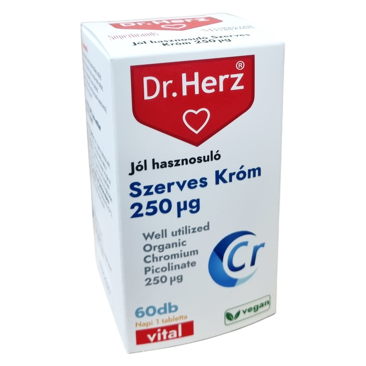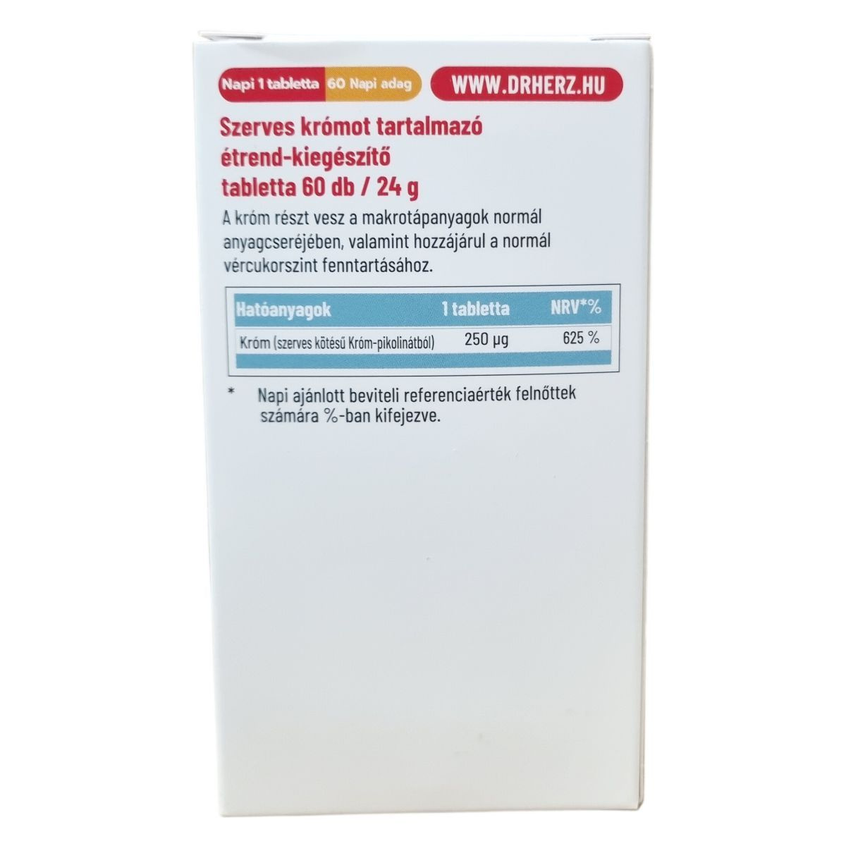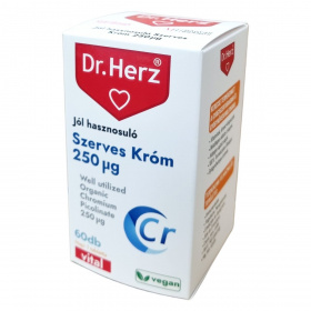 A Dr.Herz Jól hasznosuló Szerves Króm étrend-kiegészítő tabletta szerves króm-pikolinátot tartalmaz, amely a makrotápanyagok normál anyagcseréjében és a vércukorszint normál fenntartásában játszhat szerepet. A termék mikro-kristályos cellulóz, kalcium-foszfátok, különböző cellulóz alapú tömegnövelő szerek, csomósodást gátló anyagként zsírsavak magnéziumsói, valamint nedvesítőszerként glicerin felhasználásával készül. Napi egy tabletta fogyasztása ajánlott főétkezés előtt, szétrágás nélkül, bőséges folyadékkal. A termék vegán kompatibilis. Kapható gyógyszertárakban és gyógynövényboltokban, emellett a Dr.Herz kínálatában más vitaminok, étrend-kiegészítők, hidegen sajtolt olajok, 100% természetes illóolajok és gyógynövényes krémek is megtalálhatók, amelyek számos egészségügyi területet célozhatnak meg, mint például az immunerősítés, fogyókúra, méregtelenítés, emésztés, anyagcsere, szív- és érrendszer, csont, porc, ízület, férfi és női egészség, valamint a haj, bőr és köröm ápolása.