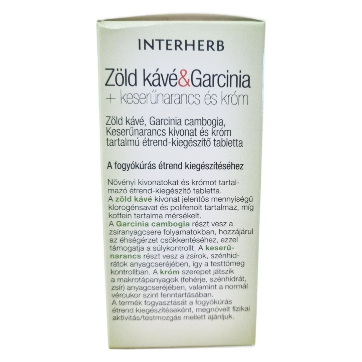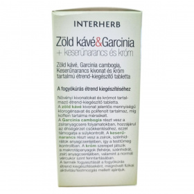 Az INTERHERB Zöld kávé & Garcinia + keserűnarancs és króm tabletta növényi kivonatokat és krómot tartalmazó étrend-kiegészítő, amelyet a fogyókúrás étrend kiegészítéseként ajánlanak. A zöld kávé kivonat jelentős mennyiségű klorogénsavat és polifenolt tartalmaz, míg koffein tartalma mérsékelt. A Garcinia cambogia részt vehet a zsíranyagcsere folyamatokban, hozzájárulhat az éhségérzet csökkentéséhez, ezzel támogathatja a súlykontrollt. A keserűnarancs részt vehet a zsírok, szénhidrátok anyagcseréjében, így segítheti a testsúly kontrollban. A króm szerepet játszhat a makrotápanyagok anyagcseréjében, valamint a normál vércukor szint fenntartásában. A termék fogyasztását a fogyókúrás étrend kiegészítéseként, megfelelő fizikai aktivitás/testmozgás mellett ajánlják.