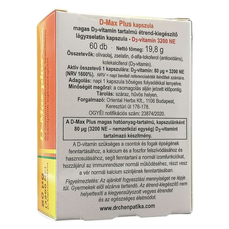 A D-Max Plus magas hatóanyag tartalmú, kapszulánként 80 µg (3200 NE-nemzetközi egység) D3-vitamint tartalmazó készítmény. A D-vitamin szükséges a csontok és fogak épségének fenntartásához, a kalcium és a foszfor felszívódásához és hasznosulásához, segít fenntartani a normál izomfunkciókat, hozzájárul az immunrendszer normál működéséhez, részt vesz a vér normál kalcium szintjének fenntartásában.