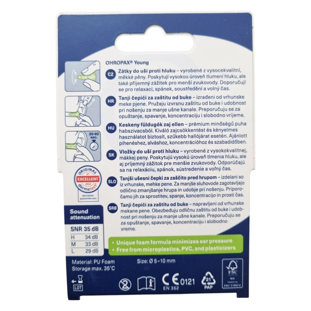 Az OHROPAX Young füldugók különösen kis méretűek, ezért kisebb hallójáratú felnőttek és gyermekek számára is alkalmasak lehetnek. A speciális PU hab formula minimális nyomást fejt ki a hallójáratra, ezáltal kényelmes hosszabb viselet során is. Kiválóan csökkenthetik a külső zajokat, így elősegíthetik a nyugodt alvást, pihenést vagy koncentrációt. SNR érték: 35 dB, méret: 5–10 mm.