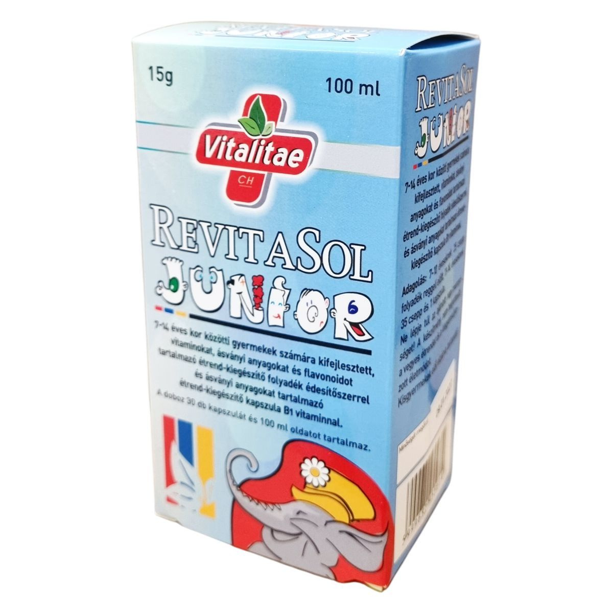 A RevitaSol Junior egy cseppentős folyadék és kapszula kombinációja, melyeket 7-14 éves gyermekek számára fejlesztettek ki. A termék vitaminokat, ásványi anyagokat és flavonoidokat tartalmaz. A doboz 30 kapszulát és 100 ml oldatot foglal magában. A folyadék édesítőszerrel készül, a kapszula pedig B1 vitamint és ásványi anyagokat tartalmaz. A terméket nedvességtől, hőtől és fénytől védve kell tárolni, gyermekek elől elzárva. A gyártás az Európai Unióban történik.