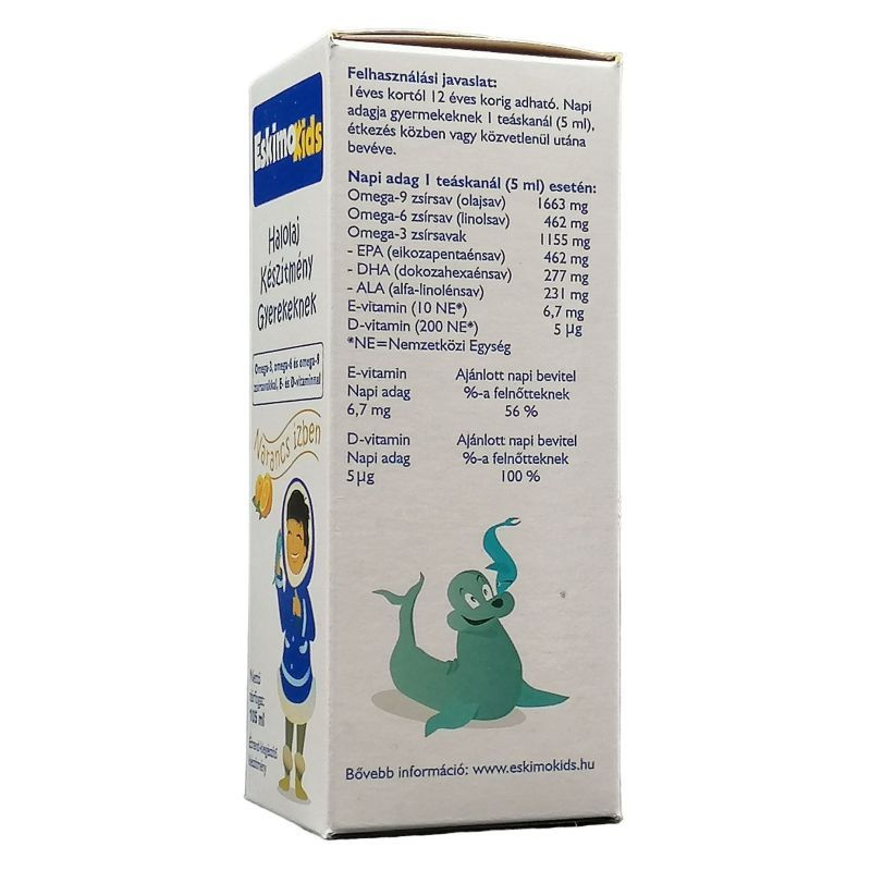 Az Eskimo Kids tisztított, biztonságos halolaj, hatékonyságát és pozitív hatásait 17 nemzetközi klinikai tanulmány bizonyítja. Az Eskimo Kids az egyedüli olyan készítmény a piacon, amelyik több mint 6 hónapig nem avasodik meg! Kiszerelés: 105 ml. Összetétel: Egy teáskanál Eskimo Kids (5 ml / napi mennyiség) esetén: Energia 170kJ (40 kcal), fehérje 0,5 mg, szénhidrát 2 g, zsír 4,60 g, ebből telített zsírsav 0,60 g, egyszeresen telítetlen zsírsav 2,00 g, többszörösen telítetlen zsírsav 1,5 g ebből Omega-6 zsírsav 500 mg,-ebből linolsav 500 mg, Omega-3 zsírsav 600 mg-ebből alfa-linolénsav 230 mg,-EPA 460 mg,-DHA 280mg, Omega-9 zsírsav (olajsav) 1400 mg, E-vitamin 6,7 mg, D-vitamin 5 mikrogramm. Természetes halolaj: Omega-3 EPA és DHA, Omega-6, természetes repce olaj, természetes D és E vitamin, természetes aromák, antioxidánsok: lecitin, aszkorbil-palmitát (A C-vitamin egyik zsírban oldódó változata, mely a legtöbb gyümölcsben és zöldségfélében előfordul). Mennyi a javasolt napi adagja a gyerekkészítménynek? Az Eskimo Kids napi adagja gyermekeknek 2,5 ml-5 ml (1 teáskanál), melyben 5 mikrogramm D vitamin van és ez 200 NE-nek felel meg (NE=Nemzetközi Egység). Ez fedezi a gyermekek D-vitamin szükségletének 50%-át. Mennyi hatóanyag van 1 kanál Eskimo Kids halolajban? Egy kávéskanál Eskimo Kids (2,5 ml / napi mennyiség) 205 mg EPA-t, 140 mg DHA-t, 3,35 mg E-vitamint és 2,5 mcg (mikrogramm) D-vitamint és repce olajat tartalmaz. A napi maximum egy teáskanál Eskimo Kids (5 ml / napi mennyiség) 460 mg EPA-t, 280 mg DHA-t, 6,7 mg E-vitamint és 5 mcg (mikrogramm) D-vitamint és repce olajat tartalmaz.