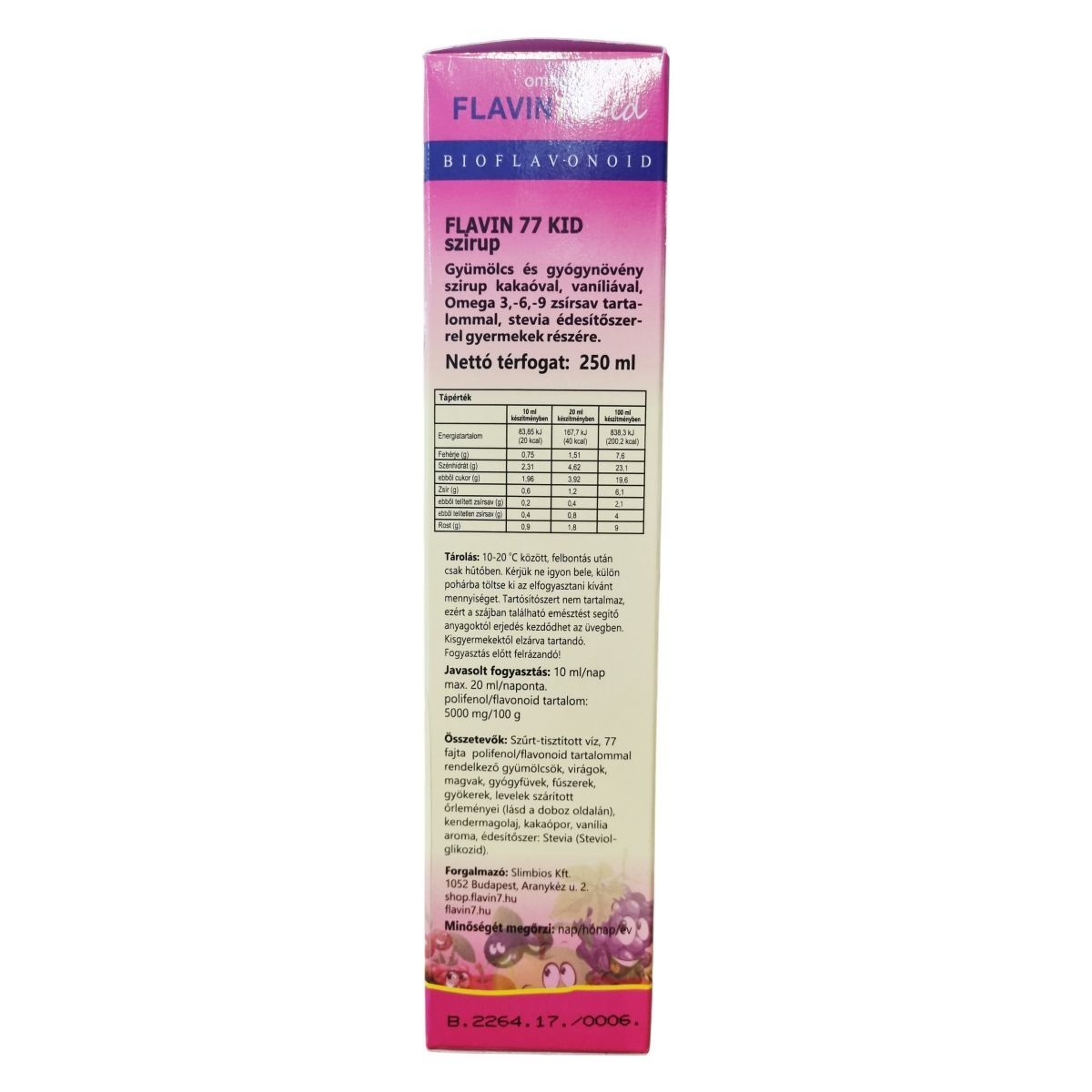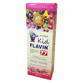 A Flavin 77 Kid szirup gyermekek számára készült különleges termék, amely 77 féle polifenolt és flavonoidot tartalmazó gyümölcsökből, virágokból, magvakból, gyógyfüvekből, fűszerekből, gyökerekből és levelekből álló szárított őrleményekből készül. A gyümölcsök között megtalálható többek között alma, bodza, fekete áfonya, homoktövis és vörösszőlő mag-héj is. A termék kakaóval, vaníliával és Omega 3,-6,-9 zsírsavakkal gazdagított, stevia édesítőszerrel készült szirup. Az összetétel részét képezi továbbá kendermagolaj és természetes aromaanyagok is. Felhívjuk a figyelmet arra, hogy a termék tartósítószert nem tartalmaz, ezért az erjedés elkerülése érdekében a tárolási és fogyasztási előírásokat pontosan be kell tartani. A szirup gyermekbarát ízesítéssel és összetétellel rendelkezik, mely a gyermeki szervezet támogatásában részesülhet.