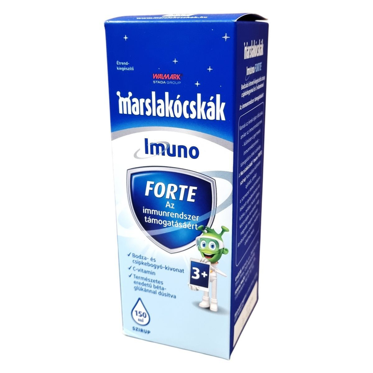 A Marslakócskák® Imuno FORTE bodzaízű étrend-kiegészítő szirup csipkebogyóval, C-vitaminnal és természetes eredetű béta-glükánnal készült, amely az immunrendszer támogatására szolgálhat, különösen gyermekek számára.
