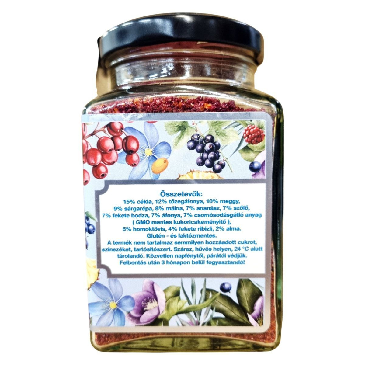 15% cékla, 12% tőzegáfonya, 10% meggy, 9% sárgarépa, 8% málna, 7% ananász, 7% szőlő, 7% fekete bodza, 7% áfonya, 7% csomósodásgátló anyag (GMO-mentes kukoricakeményítő), 5% homoktövis, 4% fekete ribizli, 2% alma.