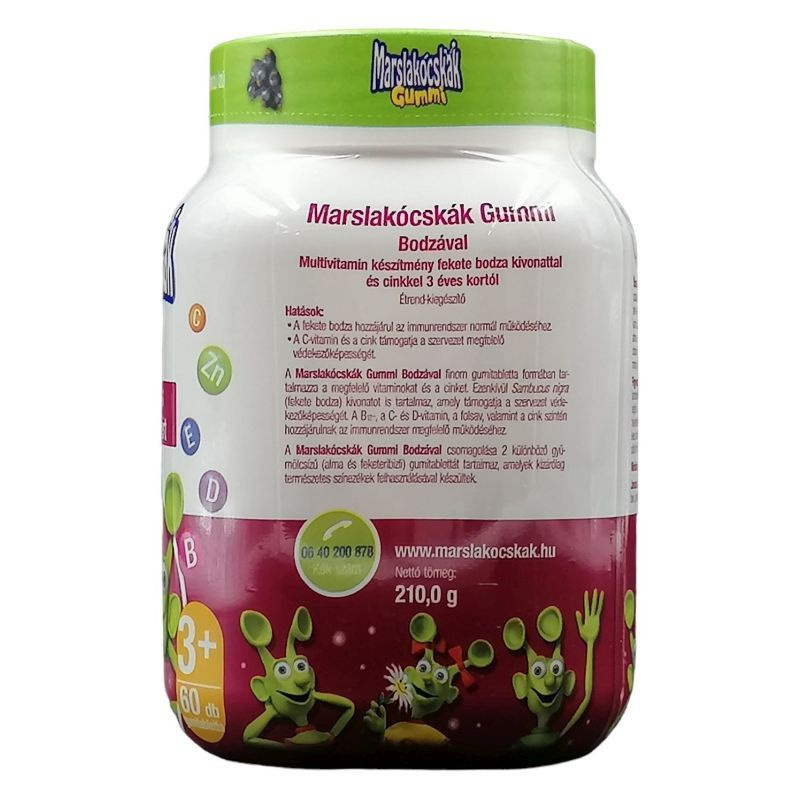 A Marslakócskák Gummi bodzával finom alma és feketeribizli ízű gumitablettái a vitaminok és a cink mellett bodza kivonatot is tartalmaz.