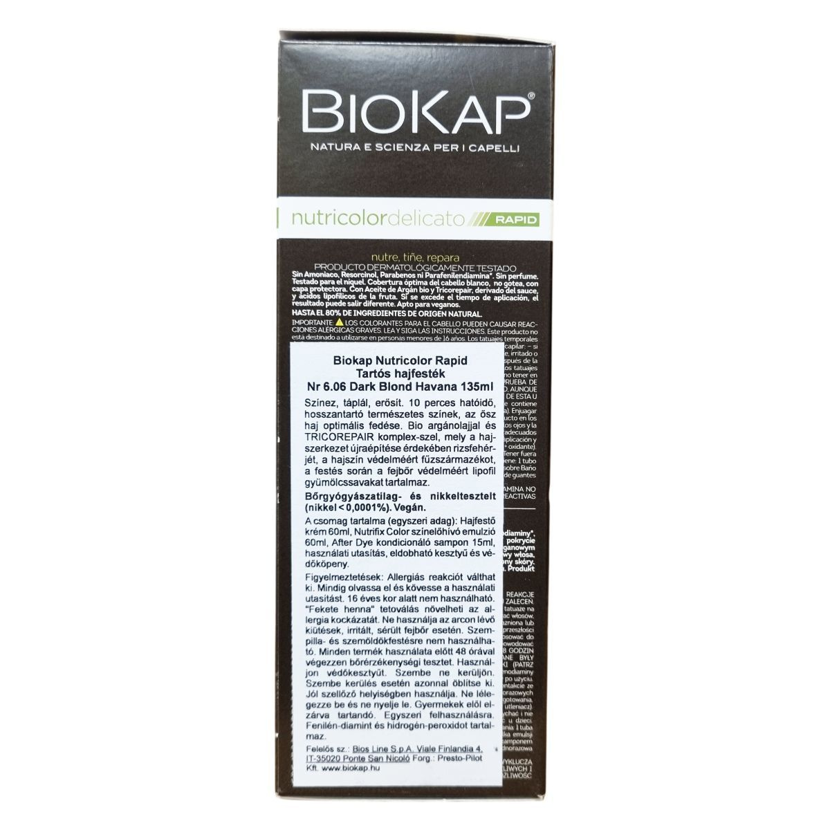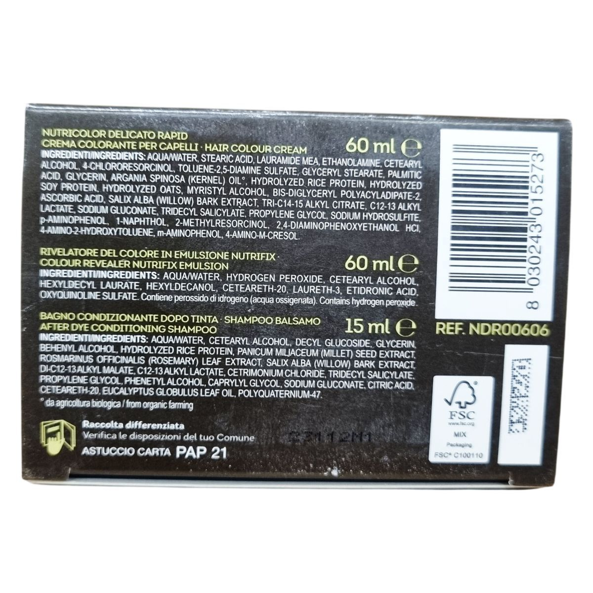 A BioKap Nutricolor Delicato Rapid hajfesték a természet és a tudomány találkozása a hajápolásban. Hatékonyan táplál, színez és erősít a rövid, 10 perces hatóidő alatt, miközben akár 80%-ban természetes eredetű összetevőkből áll. Különleges TRICOREPAIR komplexe rizsfehérjéből, fűzfa kivonatból és gyümölcssavakból áll, amelyek hozzájárulnak a haj szerkezetének újjáépítéséhez és a fejbőr védelméhez a festés alatt. A termék ammónia, resorcin, parabének, para-feniléndiamin és illatanyag nélkül készült, nikkeltesztelt (nikkel tartalom < 0,0001%) és vegánok számára is megfelelő. A csomagban külön egységcsomagolt hajfestő krém, színelőhívó emulzió, hajfestést követő kondicionáló sampon, használati utasítás, eldobható kesztyű és védőkörny található, így garantálja a biztonságos és kényelmes használatot. A terméket jól szellőző helyiségben kell alkalmazni, és figyelembe kell venni a maximális hatóidőt, mert annak túllépése eltérő eredményt okozhat. A termék kizárólag egyszeri használatra készült, és tartalmaz feniléndiamint és hidrogén-peroxidot, ezért fokozott óvatosság szükséges a használat során.