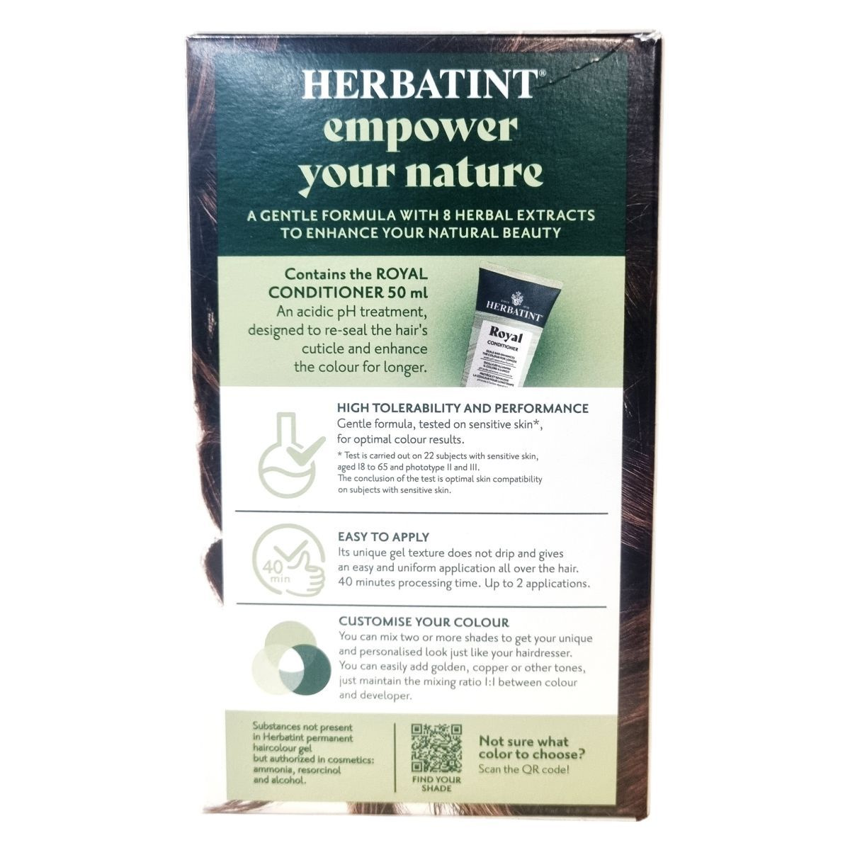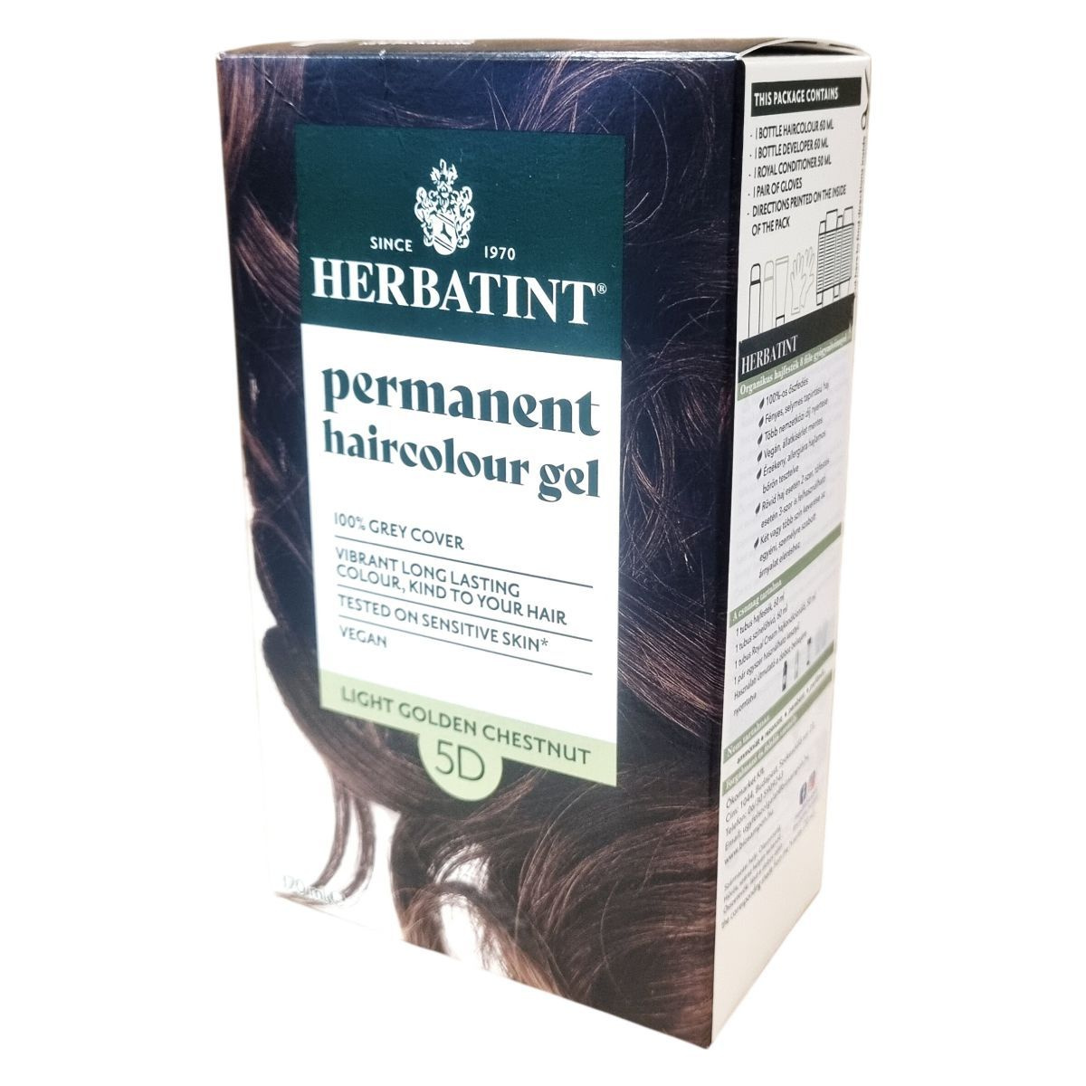 A Herbatint permanent haircolour gel egy gél állagú, csepegésmentes hajfesték, amely egyenletes felvitelt biztosít. A csomag tartalmaz egy 60 ml-es hajfestéket, egy 60 ml-es előhívót, egy 50 ml-es Royal Conditioner kondicionálót és egy pár kesztyűt. A Royal Conditioner savas pH-jú kezelés, amely segít a haj kutikulájának visszazárásában és a szín tartósságának növelésében. A feldolgozási idő 40 perc, a termék akár két alkalommal is felhasználható.