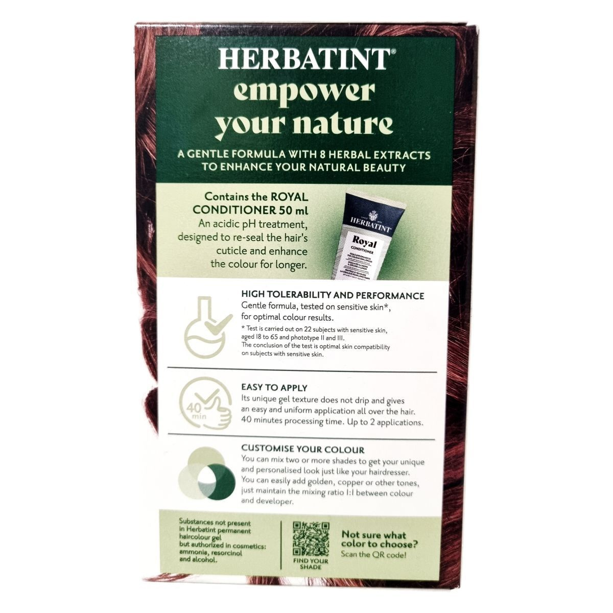A Herbatint permanent haircolour gel egy gél állagú, csepegésmentes hajfesték, amely egyenletes felvitelt biztosít. A csomag tartalmaz egy 60 ml-es hajfestéket, egy 60 ml-es előhívót, egy 50 ml-es Royal Conditioner kondicionálót és egy pár kesztyűt. A Royal Conditioner savas pH-jú kezelés, amely segít a haj kutikulájának visszazárásában és a szín tartósságának növelésében. A feldolgozási idő 40 perc, a termék akár két alkalommal is felhasználható.