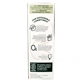 A csomagolás újrahasznosított anyagokból készül, csökkentett papírfelhasználással. Újrazárható flakonjai lehetővé teszik a maradék, nem összekevert termék későbbi felhasználását. Olaszországban gyártva, 100% zöld energiával.