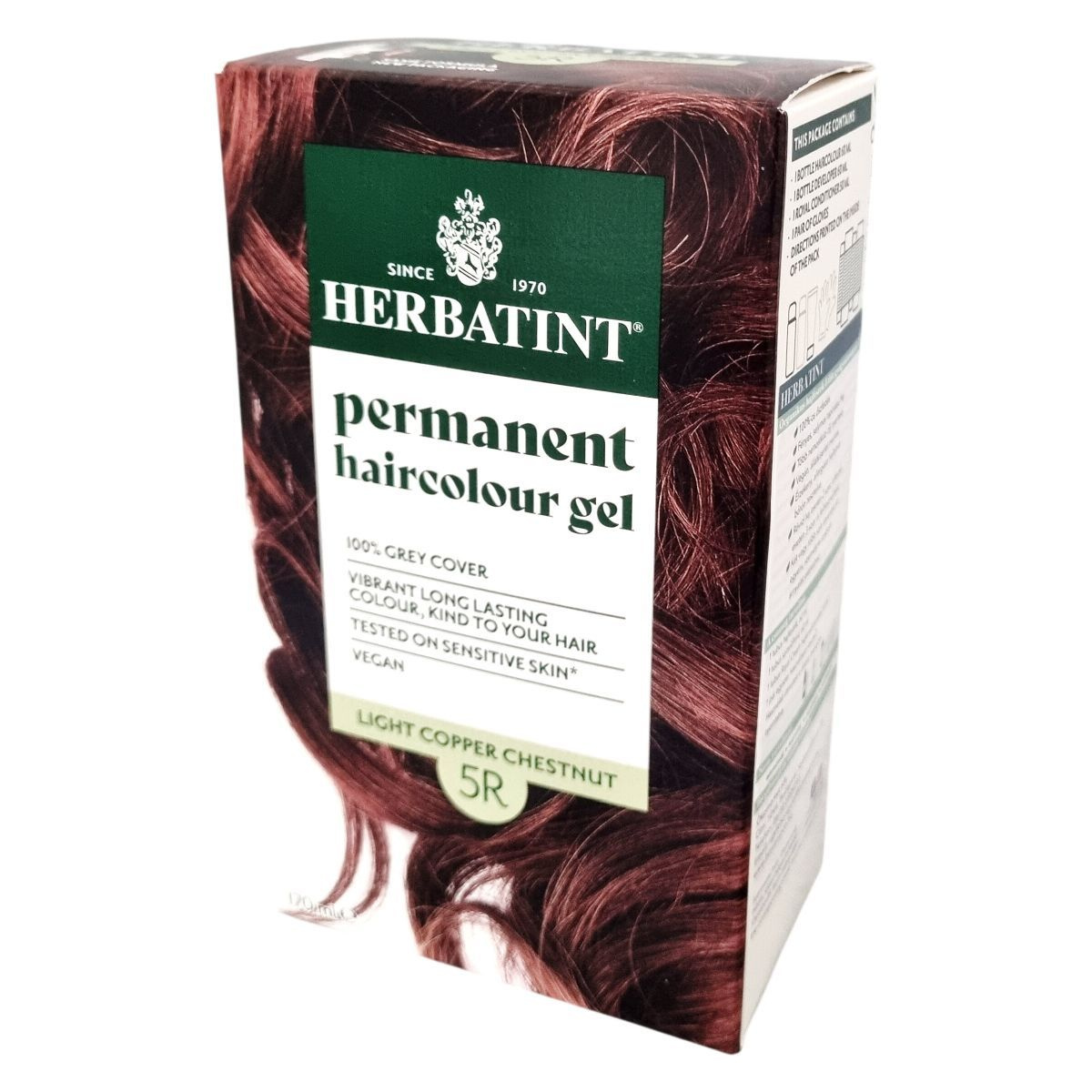 Gyengéd összetételű, világos réz gesztenye színű, tartós hajfesték gél 100%-os ősz fedéssel. Növényi kivonatokat tartalmaz, érzékeny bőrön tesztelt, vegán formula.