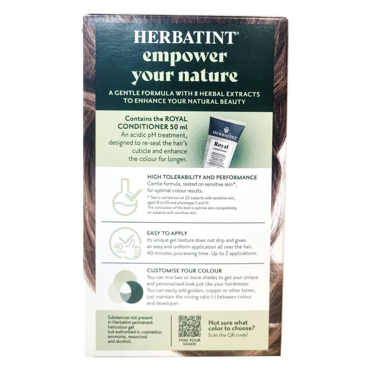 A Herbatint permanent haircolour gel egy gél állagú, csepegésmentes hajfesték, amely egyenletes felvitelt biztosít. A csomag tartalmaz egy 60 ml-es hajfestéket, egy 60 ml-es előhívót, egy 50 ml-es Royal Conditioner kondicionálót és egy pár kesztyűt. A Royal Conditioner savas pH-jú kezelés, amely segít a haj kutikulájának visszazárásában és a szín tartósságának növelésében. A feldolgozási idő 40 perc, a termék akár két alkalommal is felhasználható.