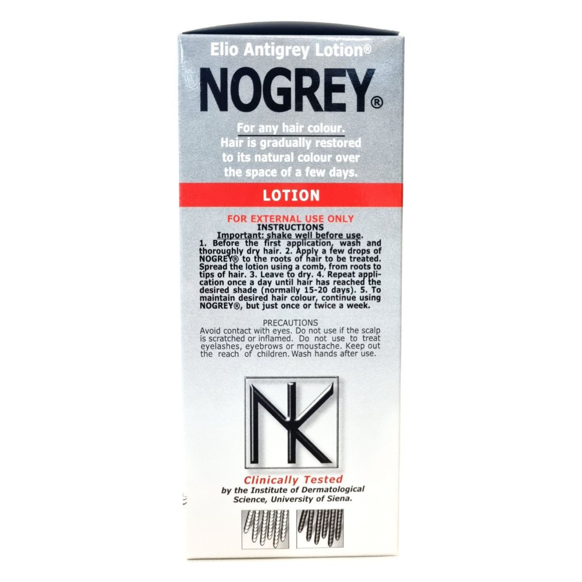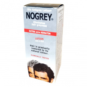 A NoGrey Elio Antigrey Lotion klinikailag tesztelt, keratinnal dúsított hajápoló, amely segíthet fokozatosan visszaállítani az ősz haj természetes színét. Nem hajfesték, hanem olyan ápoló lotion, amely támogatja a haj természetes pigmentációját. A használat első néhány hetében a haj fokozatosan sötétedhet, visszanyerve eredeti tónusát. A keratin hozzájárulhat a haj erősítéséhez és rugalmasságának növeléséhez. A terméket a Sienai Egyetem Dermatológiai Intézete klinikailag tesztelte, biztonságos külső használatra. A NoGrey használata során a haj fényesebb, egészségesebb megjelenésű lehet, miközben természetes színe fokozatosan visszatér.
