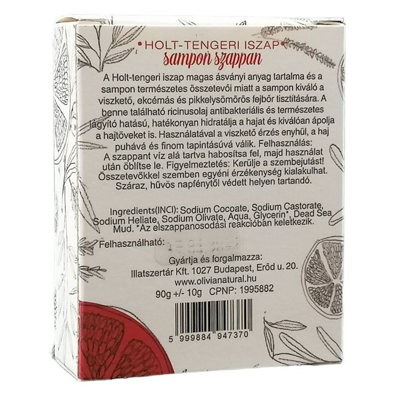 ÖSSZETÉTEL (INCI): Sodium Cocoate (elszappanosított kókuszzsír), Sodium Heliate (elszappanosított napraforgóolaj), Sodium Olivate (elszappanosított olívaolaj), Sodium Castorate (elszappanosított ricinusolaj), Aqua (víz), Dead Sea Mud (Holt-tengeri iszap).