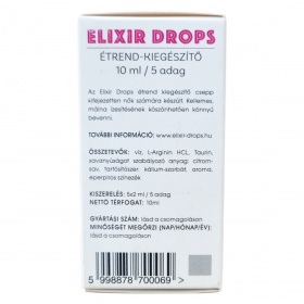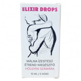 Az Elixir Drops egy málna ízesítésű étrend-kiegészítő női használatra, mely 10 ml-es kiszerelésben, 5 adagra osztva érhető el. A termék hatóanyagai között L-Arginin HCL és Taurin található, melyeket 2 pipettányi adagban (kb. 2 ml) javasolt bevenni. A termék vízből, citromsavból, kálium-szorbátból, aroma- és színezék-komponensekből áll, melyek biztosítják frissességét és kellemes ízét. A készítmény használata során fontos a javasolt adag betartása, és a gyermekektől való elzárás. A termék előállításának helye az EU, és kizárólag nők számára készült.