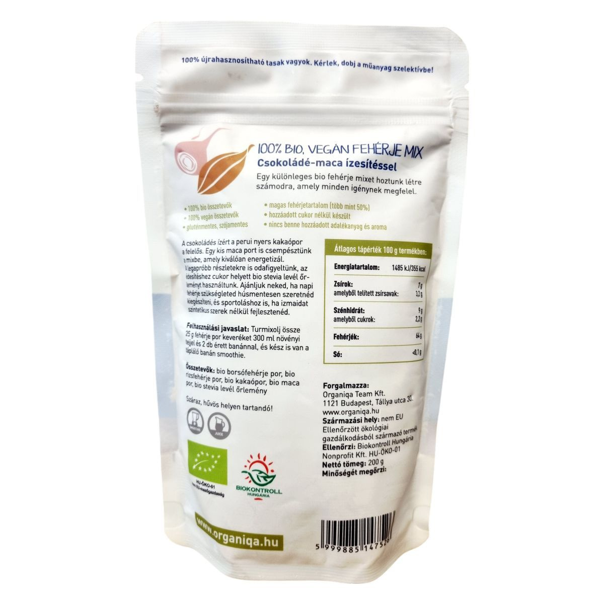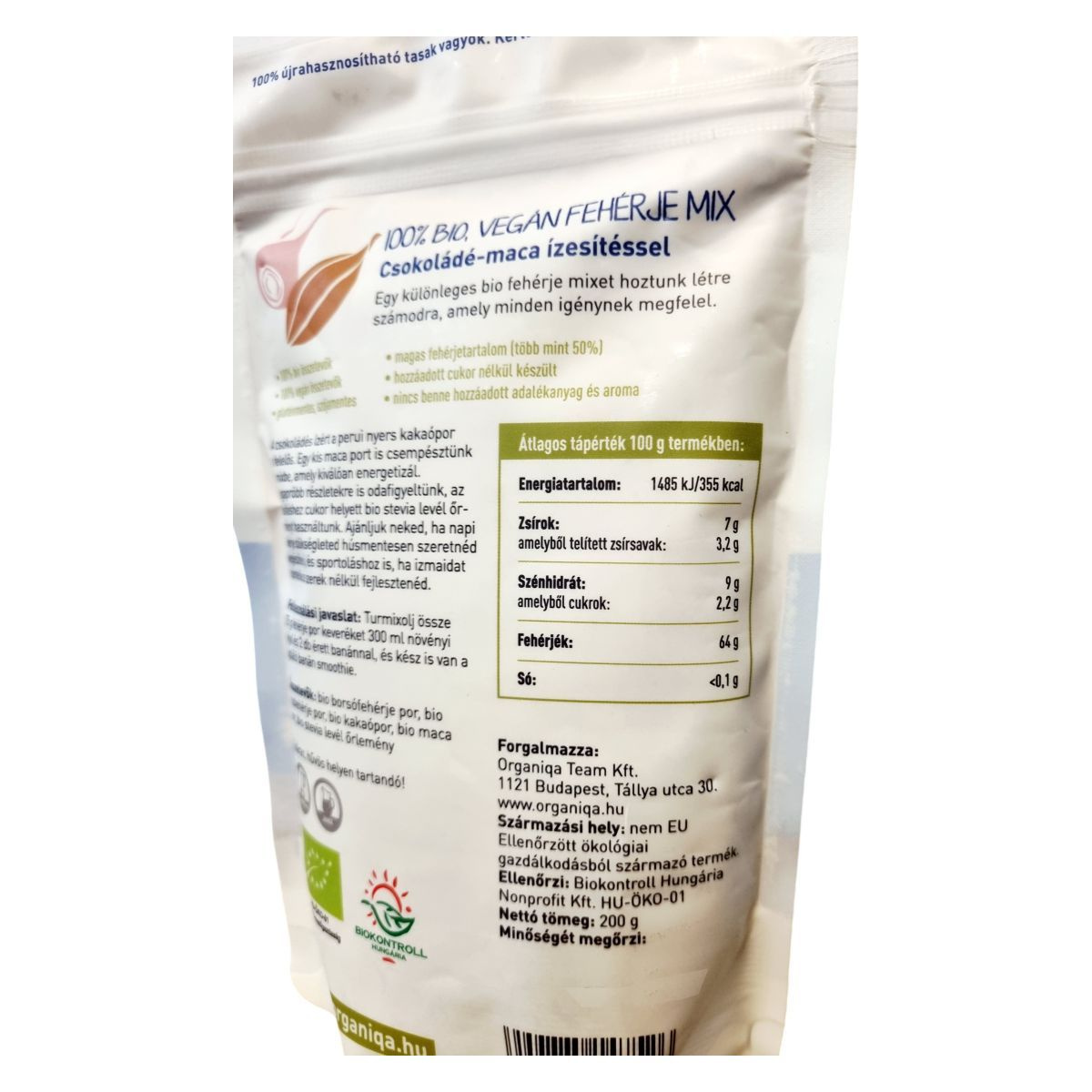 Az Organiqa Csokoládé & Maca Vegán Fehérje Mix egy 100% bio és vegán fehérje keverék, amely csokoládé-maca ízesítéssel készült. A termék magas fehérjetartalmú, több mint 50%-os fehérjetartalommal rendelkezik, és nem tartalmaz hozzáadott cukrot, adalékanyagokat vagy aromákat. A perui nyers kakaópor és a maca por energetizáló hatású lehet, míg a bio stevia levél őrlemény természetes édesítőszerként szolgál. A termék ideális lehet azok számára, akik húsmentesen szeretnék kiegészíteni napi fehérjebevitelüket, és sportoláshoz is ajánlott, ha izmaikat szintetikus szerek nélkül szeretnék fejleszteni. A termék 100% újrahasznosítható tasakban kapható, és a Biokontroll Hungária Nonprofit Kft. ellenőrzi.