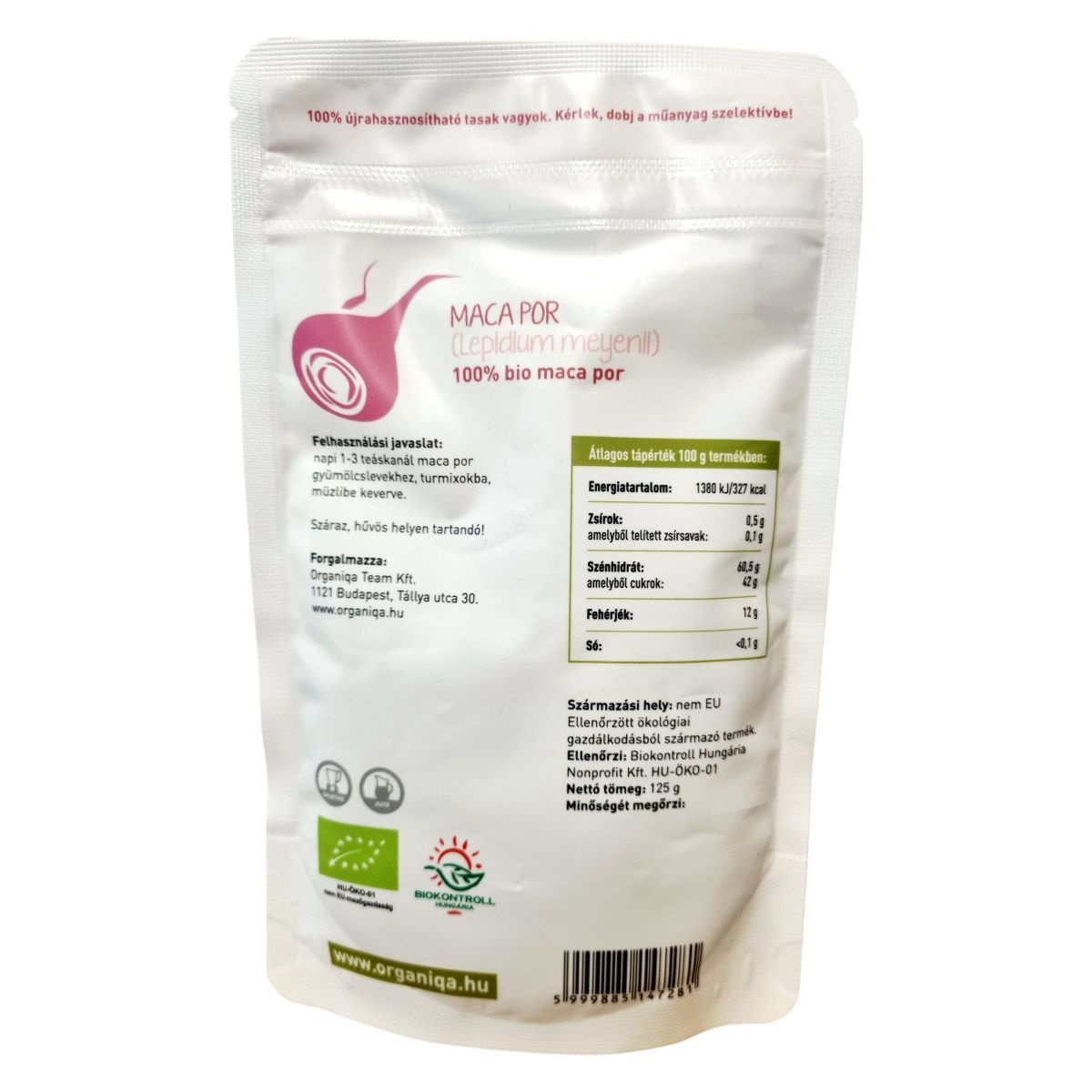 Az Organiqa Maca por egy 100% bio termék, amely a Lepidium meyenii növényből készül. A termék újrahasznosítható tasakban érkezik, amelyet a műanyag szelektív hulladékgyűjtőbe lehet dobni. A maca por nem EU-s származású, ellenőrzött ökológiai gazdálkodásból származik, és a Biokontroll Hungária Nonprofit Kft. által ellenőrzött. A termék forgalmazója az Organiqa Team Kft., amelynek székhelye Budapest, Tállya utca 30. A termék minőségét megőrzi a csomagoláson feltüntetett időpontig.