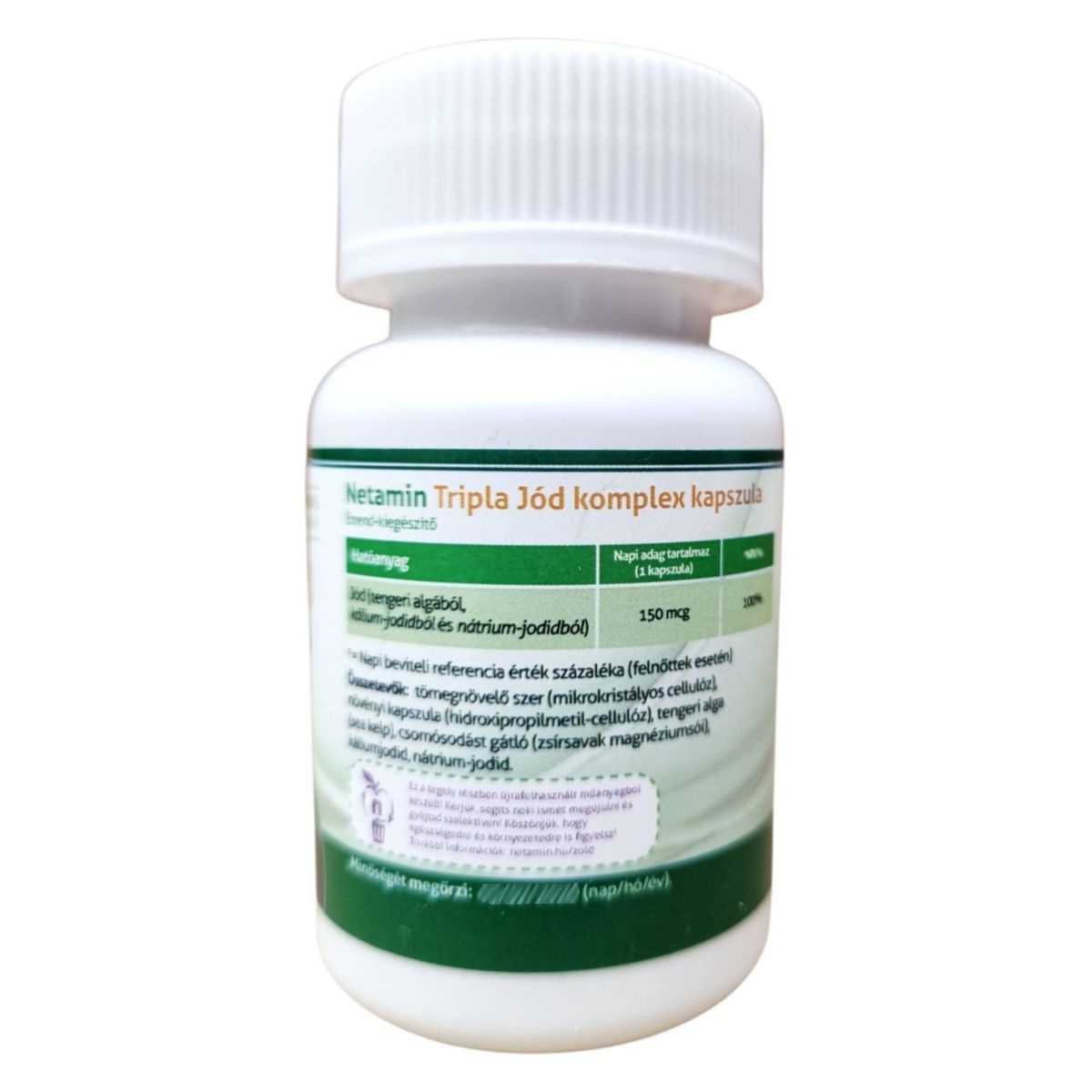 A Netamin Tripla Jód komplex kapszula egy vegán étrend-kiegészítő, amely háromféle jód-forrást tartalmazhat: tengeri alga, nátrium-jodid és kálium-jodid. A jód hozzájárulhat az idegrendszer normál működéséhez, valamint a pajzsmirigyhormonok normál termeléséhez és a pajzsmirigy normál működéséhez. A termék 60 kapszulát tartalmaz, és felnőttek számára napi 1 kapszula fogyasztása ajánlott, lehetőleg étkezés közben. Fontos, hogy az ajánlott napi adagot ne lépje túl, és a termék nem helyettesíti a kiegyensúlyozott vegyes étrendet és az egészséges életmódot. Tárolása száraz, sötét helyen, szobahőmérsékleten, gyermekektől elzárva javasolt.