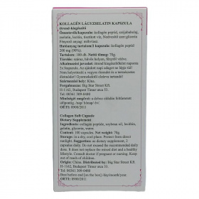 A kollagén felelős a bőr és a bőr alatti szövetek rugalmasságáért, feszességéért, a csontok, haj, bőr állapotáért. , Hiánya esetén fáradság kimerültség ízületi problémák jelentkezhetnek. Alkalmazási javaslat: naponta 2 kapszula javasolt étkezés után vagy közben. Összetevők: kollagénpeptid, szójababolaj, zselatin, lecitin, tisztított víz. Nedvesítő szer: glicerin. Fényező anyag: méhviasz. Hatóanyag-tartalom/2 kapszula: kollagénpeptid 200 mg.