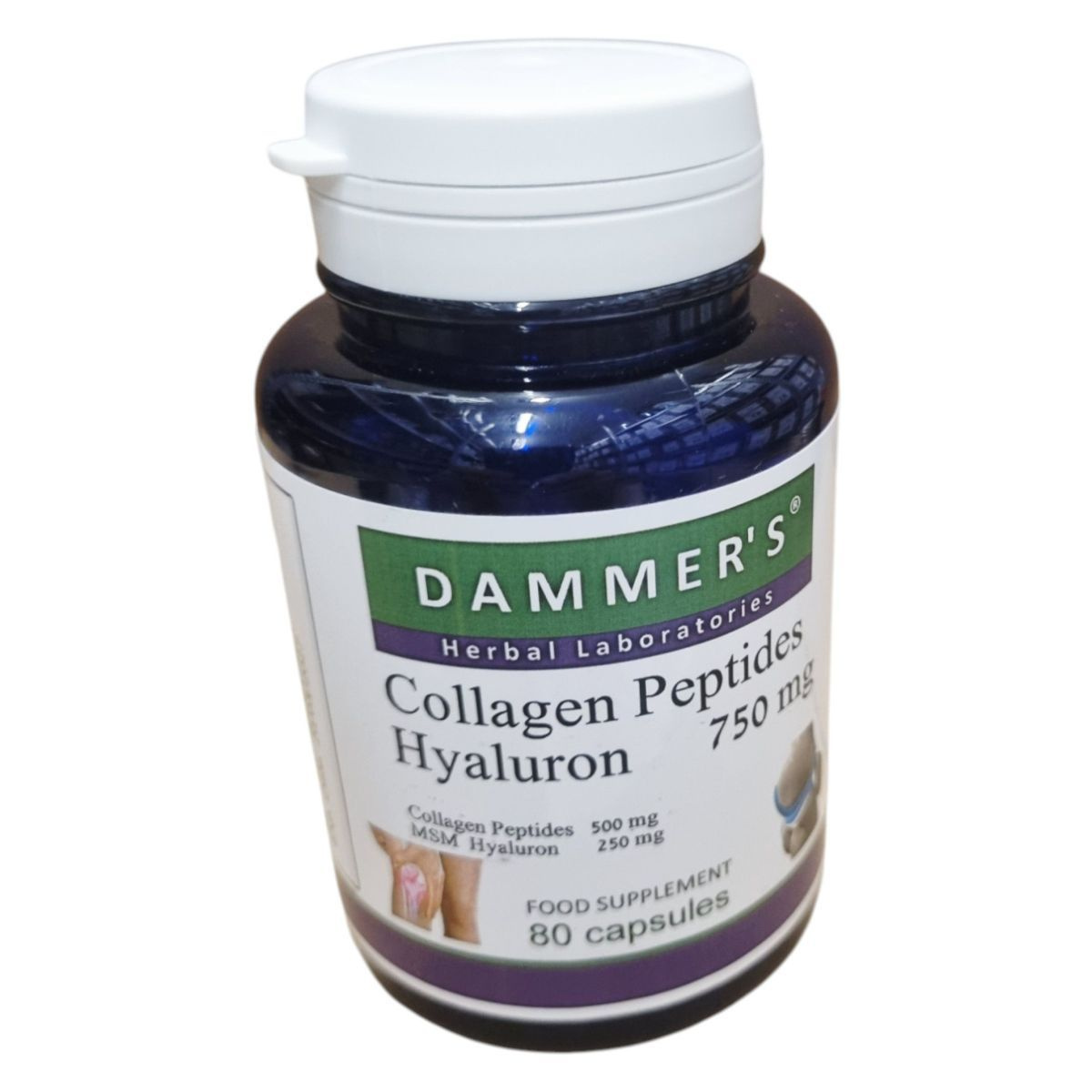 A DAMMER'S Collagen Peptides Hyaluron étrend-kiegészítő 80 kapszulát tartalmaz, amely marhakollagént, halkollagént, hialuronsavat és MSM-et foglal magában. Ezek az összetevők potenciálisan támogathatják a bőr, ízületek és kötőszövetek egészségét. A termék napi adagja 6 kapszula, amely jelentős mennyiségű kollagént és MSM-et biztosíthat a szervezet számára. A terméket a Dammers Hungary Bt. forgalmazza, és fontos, hogy az ajánlott napi adagot ne lépjük túl, valamint tartsuk gyermekek elől elzárva.