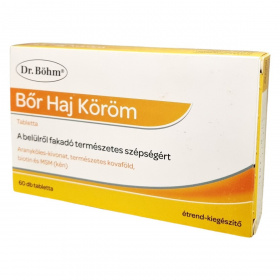 Dr. Böhm® Bőr Haj Köröm tabletta egy olyan étrend-kiegészítő, amelynek célja a bőr, a haj és a köröm egészségének támogatása. Az egyedülálló összetétel aranyköles-kivonatot és természetes kovaföldet tartalmaz, amelyek természetes szilíciumforrásként szolgálnak. A biotin hozzájárulhat az egészséges bőr megőrzéséhez, míg a szelén az egészséges haj fenntartásához, a réz pedig a haj normál pigmentációjához. A cink hozzájárulhat a köröm egészségéhez. A tabletták emellett metil-szulfonil-metánt (MSM) is tartalmaznak, amely kénforrás lehet. Az étrend-kiegészítő formában található vitaminok és ásványi anyagok napi adagja biztosítani tudja a szervezet számára szükséges tápanyagokat. A termék laktóz- és gluténmentes, így széles körben alkalmazható. A megfelelő hatás elérése érdekében ajánlott legalább három hónapon keresztül naponta kétszer bevenni egy tablettát, majd igény szerint folytatni a szedést.