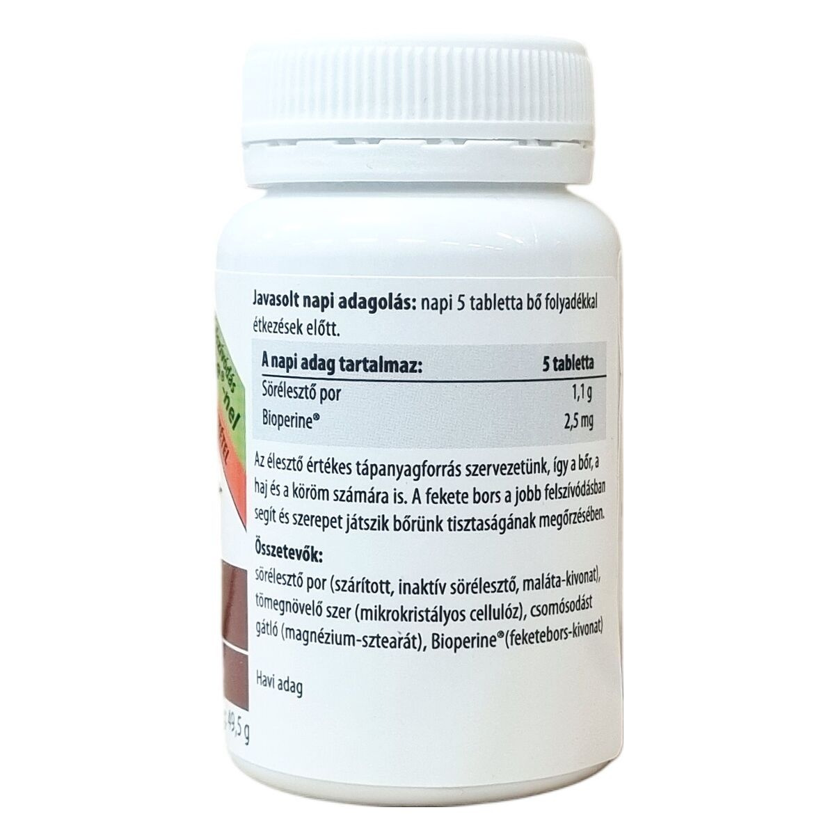 sörélesztő por (szárított, inaktív sörélesztő, maláta-kivonat), tömegnövelő szer (mikrokristályos cellulóz), csomósodást gátló (magnézium-sztearát), Bioperine® (feketebors-kivonat)