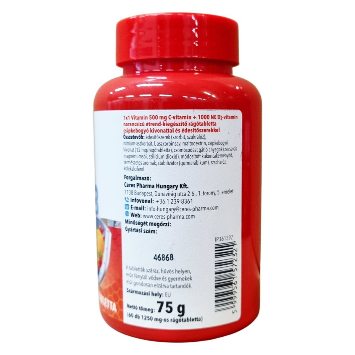 A 1x1 Vitamin C+ D3 + Csipkebogyó kivonat rágótabletta 500 mg C-vitamint, 1000 NE D3-vitamint (25 µg) és 12 mg csipkebogyó kivonatot tartalmaz tablettánként. A C- és D3-vitaminok hozzájárulhatnak az immunrendszer normál működéséhez. A készítmény narancsízű és édesítőszereket is tartalmaz, mint a szorbit, szukralóz és szacharin. A csomósodást gátló anyagok, stabilizátor és természetes aromák biztosítják a rágótabletta minőségét és ízét. A termék nettó tömege 75 g (60 db 1250 mg-os rágótabletta). Az EU-ban készült, az IP361392 jelzéssel ellátott étrend-kiegészítő táplálék-kiegészítőként alkalmazható, az ajánlott adag betartása mellett, kiegyensúlyozott étrend és egészséges életmód részeként.