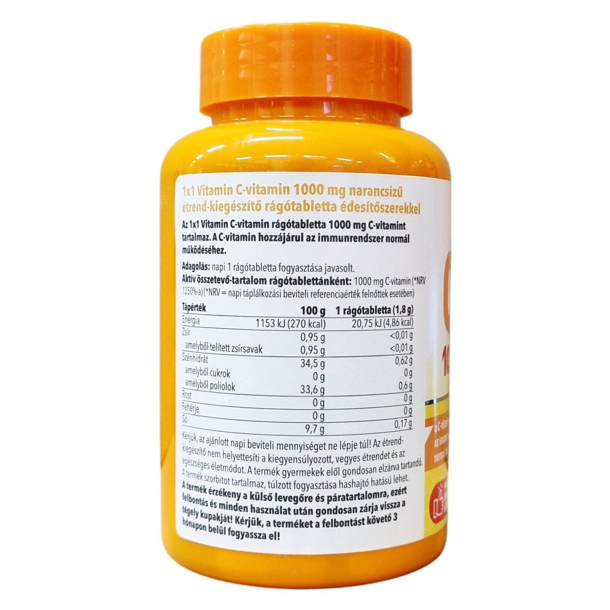 Az 1x1 Vitamin C-vitamin rágótabletta 1000 mg C-vitamint tartalmaz, amely hozzájárulhat az immunrendszer normál működéséhez. A termék narancsízű és édesítőszereket (szorbit, szukralóz) tartalmaz, és csomósodást gátló, stabilizáló anyagokat alkalmaznak az összetételében. Nettó tömege 108 g, amely 60 db rágótablettát tartalmaz. Az összetevők között szerepelnek továbbá maltodextrin, narancs aroma, gumiarábikum. A termék származási helye az Európai Unió. A rágótabletták fogyasztása során ajánlott az adagolási előírásokat betartani és a terméket gyermekektől elzárva tárolni.