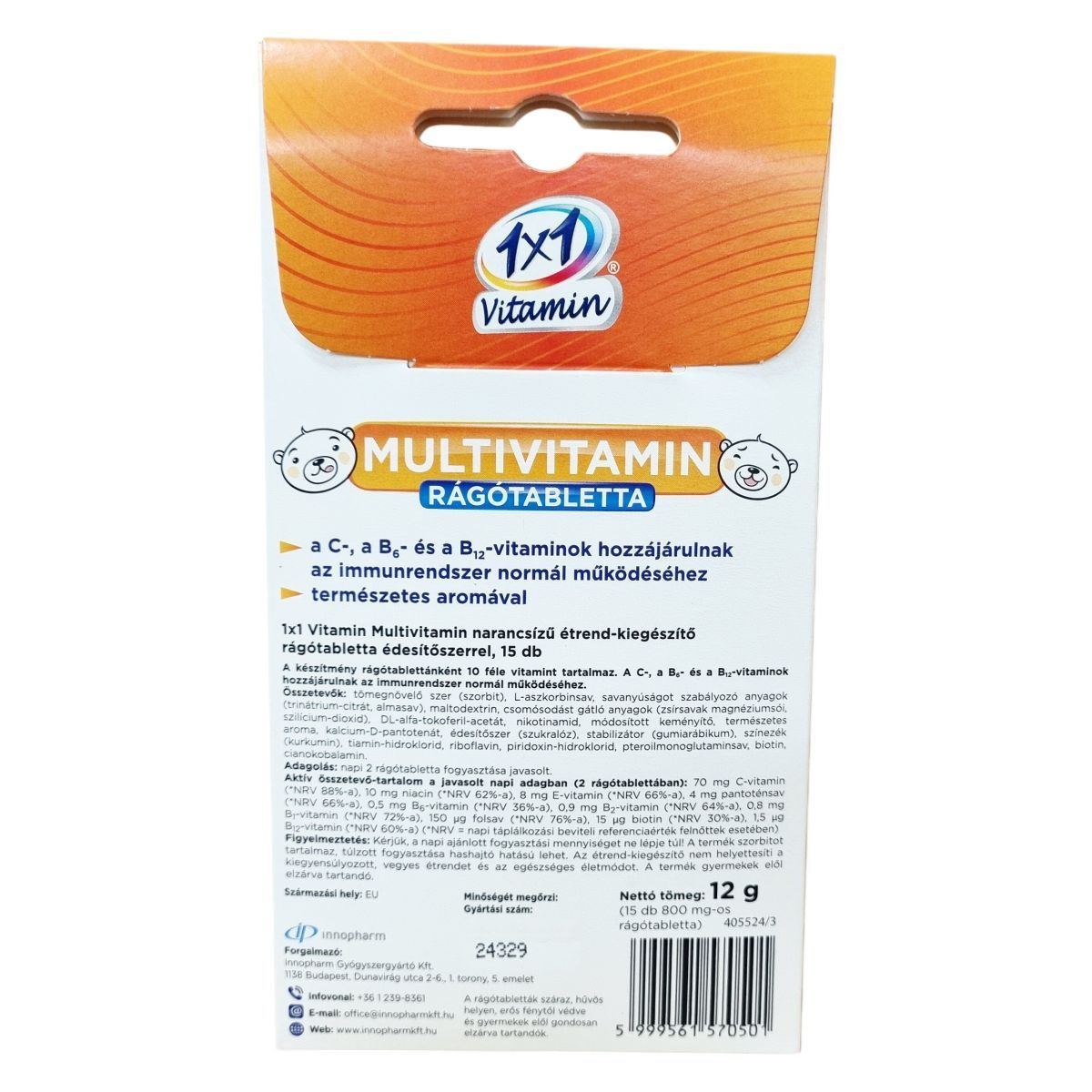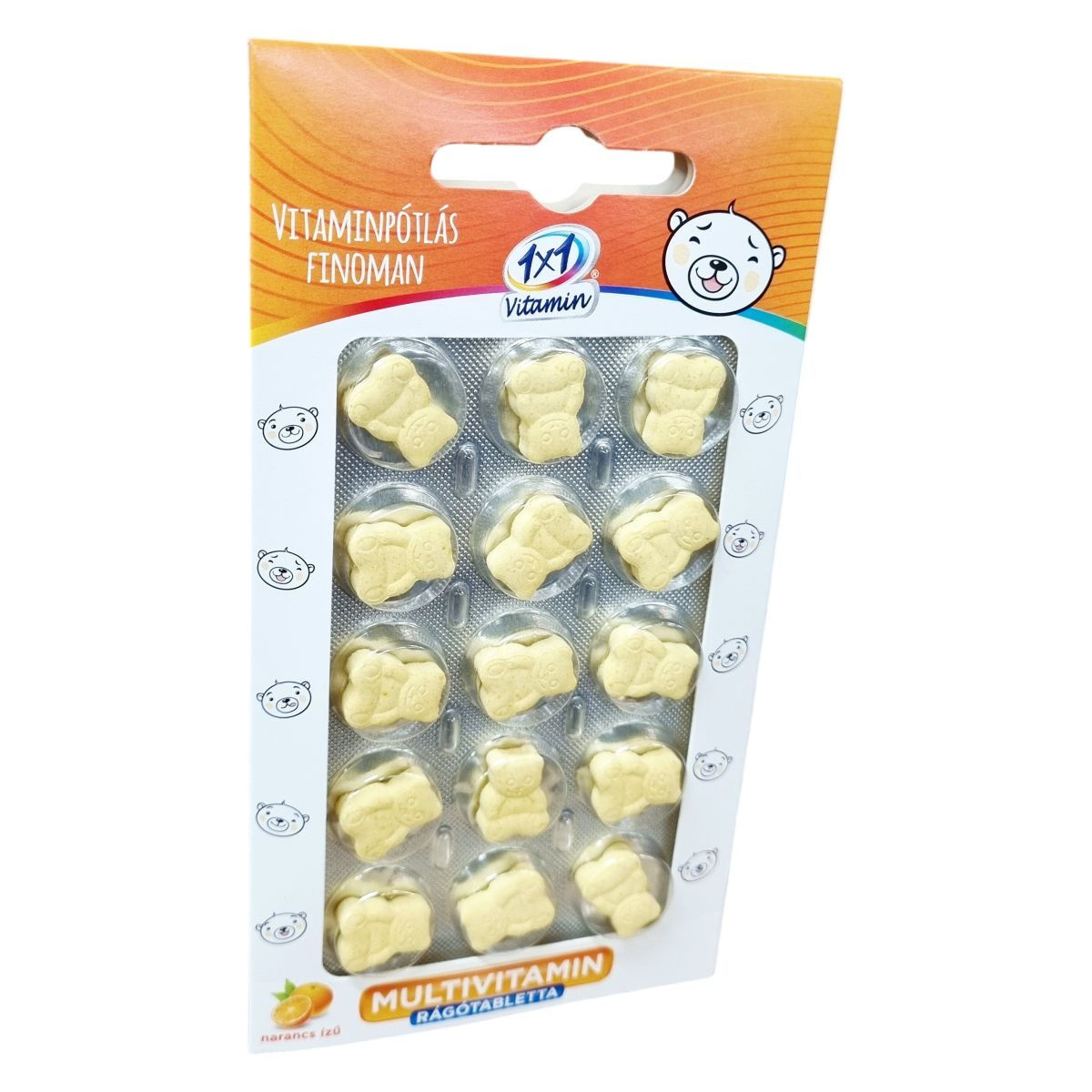 Az 1x1 Vitamin Multivitamin narancsízű étrend-kiegészítő rágótabletta 15 darab 800 mg-os tablettát tartalmaz. Rágótablettánként tízféle vitamint tartalmaz a készítmény. Kiemelten a C-, B6- és B12-vitaminok hozzájárulhatnak az immunrendszer normális működéséhez. Az összetevők között található többek között L-aszkorbinsav, nikotinamid, természetes aroma és számos B-vitamin. A termék édesítőszerrel (szukralóz) készül, valamint tartalmaz színezéket (kurkumin) és stabilizátort (gumiarábikum). Származási helye az EU. A napi ajánlott fogyasztás két tabletta, amely fedezi a felnőttek számára javasolt napi táplálkozási beviteli referenciaérték jelentős részét számos vitaminból. A termék biztonsági figyelmeztetése szerint a szorbit tartalma miatt túlzott fogyasztása hashajtó hatással járhat, ezért figyelni kell az adagolásra, továbbá fontos, hogy a termék gyermekek elől el legyen zárva.