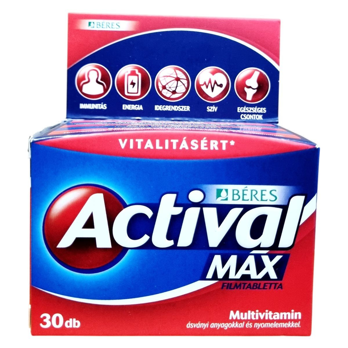 Az Actival Max filmtabletta egy komplex étrend-kiegészítő, amely multivitaminokat, ásványi anyagokat és nyomelemeket tartalmaz. A termék emelt C-vitamin tartalmú, amely hozzájárulhat az immunrendszer megfelelő működéséhez. A termék fogyasztása elsősorban jelentős fizikai és szellemi igénybevétel, kiegyensúlyozatlan táplálkozás, valamint betegségek utáni lábadozás esetén ajánlott. A készítmény összetevői hozzájárulhatnak a szervezet megfelelő vitamin, ásványi anyag és nyomelem ellátottságához, ezáltal támogathatják a jó közérzet és a teljesítőképesség fenntartását.