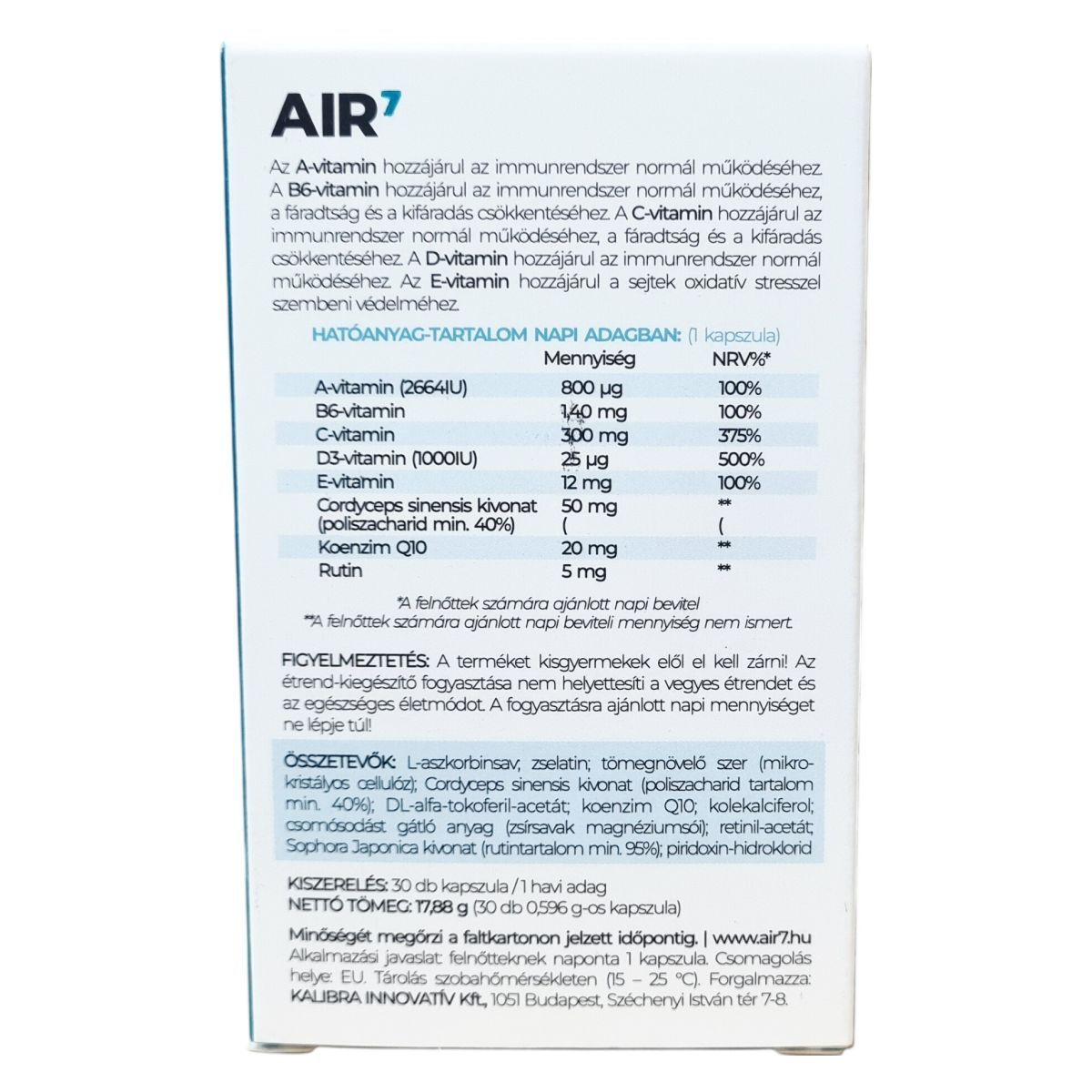 Az AIR7 kapszula olyan hatóanyagokat tartalmaz, amelyek hozzájárulhatnak az immunrendszer normál működéséhez, továbbá a fáradtság és a kifáradás csökkentéséhez. Az A-, B6-, C- és D-vitaminok, valamint az E-vitamin antioxidáns védelemmel szolgálhatnak a sejtek számára. A Cordyceps sinensis kivonat poliszacharidokat tartalmaz, a koenzim Q10 és a rutin pedig kiegészítheti az immunrendszer támogatását. A termék 30 darab kapszulás kiszerelésű, amely nagyjából egy hónapra elegendő adag.