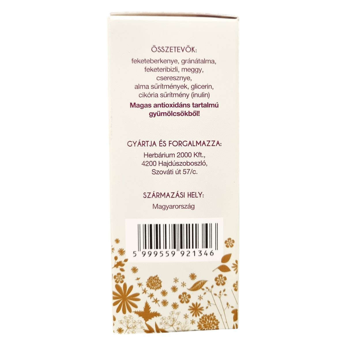 feketeberkenye, gránátalma, feketeribizli, meggy, cseresznye, alma sűrítmények, glicerin, cikória sűrítmény (inulin)