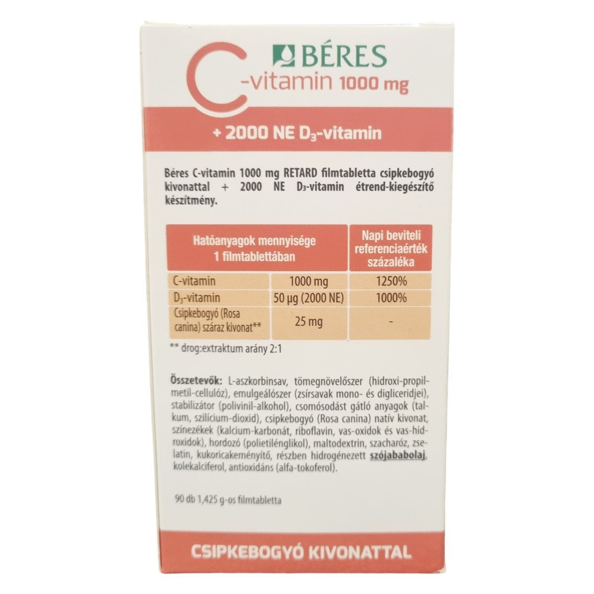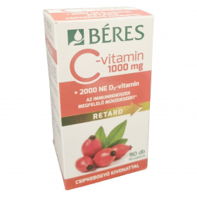 A Béres C-vitamin 1000 mg + 2000 NE D3-vitamin retard filmtabletta csipkebogyó kivonattal étrend-kiegészítő készítmény, melynek egy filmtablettája 1000 mg C-vitamint, 50 µg (2000 NE) D3-vitamint és 25 mg csipkebogyó száraz kivonatot tartalmaz, utóbbi 2:1 drog:extraktum arányban. A C-vitamin hozzájárulhat az immunrendszer és az idegrendszer megfelelő működéséhez, a fáradtság és a kifáradás csökkentéséhez, továbbá a normál energiatermelő anyagcsere-folyamatokhoz. Emellett antioxidáns hatású anyagként a sejtek oxidatív stresszel szembeni védelmét támogathatja. A D-vitamin az immunrendszer normál működésében és az egészséges izomfunkció fenntartásában játszhat szerepet, valamint részt vehet a sejtosztódás folyamatában. A termék ellenőrzött alapanyagokból és rendszeresen ellenőrzött hatóanyag-tartalommal készül, hazai fejlesztésű készítményként. Alkalmazása javasolt többek között egyoldalú, vitaminhiányos táplálkozás esetén, fokozott vitamin-szükséglet idején, betegségeket követő felépülés során, valamint fáradtság és jelentős fizikai igénybevétel időszakában.