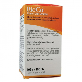 A BioCo Lizin C+Cink Komplex három hatóanyag kombinációja, jelentős mennyiségű L-lizinnel, mely egy esszenciális aminosav. Szervezetünk nem tudja előállítani, így a szükséges mennyiséget táplálkozásunkkal fedezhetjük. A BioCo Lizin C+Cink Komplex napi adagja jelentős, 1,5-2,5 g lizin bevitelt biztosít. A magas dózis miatt a tabletta a lizinre jellemzően sós, enyhén keserű ízű lehet.